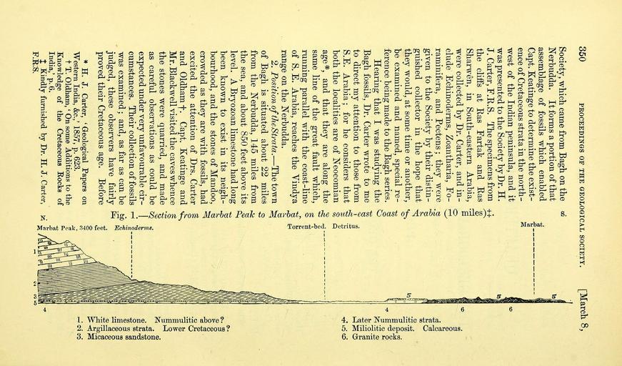 | Keywords: The Quarterly journal of the Geological Society of London (12471248373).jpg 350 <br> PROCEEDINGS OF THE GEOLOGICAL SOCIETY March 8 <br> Society which came from Bagh on the <br> Kerbiidda It forms a portion of that <br> assemblage of fossils which enabled <br> Capt Keatinge to determine the exist- <br> ence of Cretaceous strata in the north- <br> west of the Indian peninsula and it <br> was presented to the Society by Dr H <br> J Carter F E S The specimens from <br> the cliifs at Has Tartak and Has <br> Sharwen in South-eastern Arabia <br> were collected by Dr Carter and in- <br> clude Echinoderms Zoantharia Fo- <br> raminifera and Pectens ; they were <br> given to the Society by their distin- <br> guished collector in the hope that <br> they would at some time or another <br> be examined and named special re- <br> ference being made to the Bagh series <br> Hearing that I was studying the <br> Bagh fossils Dr Carter wrote to me <br> to direct my attention to those from <br> S E Arabia; for he considers that <br> both the localities are of Neocomian <br> age and that they are along the <br> same line of the great fault which <br> running parallel with the coast-line <br> of S E Arabia reaches the Yindya <br> range on the Nerbudda <br> 2 Position oftheStrata ” The town <br> of Bagh is situated about 22 miles <br> from the Nerbudda 145 miles from <br> the sea and about 850 feet above its <br> level A Bryozoan limestone had long <br> been known to exist in its neigh- <br> bourhood and the stones of Mandoo <br> crowded as they are with fossils had <br> excited the attention of Drs Carter <br> and Oldham f Capt Keatinge and <br> Mr Blackwell visited the caves whence <br> the stones were quarried and made <br> as careful observations as could be <br> expected under very unfavourable cir- <br> cumstances Their collection of fossils <br> was examined ; and as far as can be <br> judged these observers have fairly <br> proved their Cretaceous age Before <br> H J Carter ' Geological Papers on <br> Western India c ' 1857 p 623 <br> t T Oldham ' On some Additions to the <br> Knowledge of the Cretaceous Eocks of <br> India ' p 6 <br> X Kindly furnished by Dr H J Carter <br> S <br> ftn <br> 2Q <br> f 34892024 108495 51125 Page 350 Text v 21 http //www biodiversitylibrary org/page/34892024 1865 Geological Society of London NameFound Zoantharia NameConfirmed Zoantharia EOLID 1821 NameBankID 2572179 Biodiversity Heritage Library The Quarterly journal of the Geological Society of London v 21 1865 Geology Periodicals Smithsonian Libraries bhl page 34892024 dc identifier http //biodiversitylibrary org/page/34892024 smithsonian libraries Information field Flickr posted date ISOdate 2014-02-12 Check categories 2015 August 26 CC-BY-2 0 BioDivLibrary https //flickr com/photos/61021753 N02/12471248373 2015-08-27 10 00 32 cc-by-2 0 PD-old-70-1923 The Quarterly journal of the Geological Society of London 1865 Photos uploaded from Flickr by Fæ using a script |