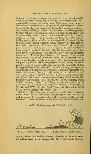 Keywords: The Quarterly journal of the Geological Society of London (14075753995).jpg 6 PROP T G BOIS'NEY OS THE GEOLOGY <br> beneath this mica-schist comes the mass of rock which forms the <br> headland of Prawle Point and is exposed in the grand cliffs for a <br> considerable distance on either side This latter rock varies in <br> colour from a dull green to a light j ellowish epidote green Some- <br> times rapidly alternating bands of different tint appear to indicate a <br> very distinct bedding at others it is more massive and homogeneous <br> Generally it has a somewhat decomposed aspect ; in the latter case <br> it is often Yery rotten passing into a crumbling earthy or sandy <br> material sometimes of a rusty colour and forming a pitted carious- <br> looking surface the rounded hollows being occasionally several inches <br> in diameter and three or four inches deep It frequently reminded me <br> of a rotten greenstone tuff; and now and then I could have sup- <br> posed myself to be looking at a decomposed diabase In two or <br> three places I fancied I detected a slightly fragmental aspect but <br> could never satisfy myself that this was more than an accidental <br> resemblance In other places however the banding of the rock is <br> very distinct and it has more the aspect of an ordinary schist <br> though the foliation is seldom or never of a kind that renders it <br> conspicuously fissile Still though rightly classed among the meta- <br> morphic rocks it may be well to keep in view the possibility of this <br> having once been a fine basic tuff As will presently be seen from <br> examination of the microscopic structure it is rather difficult to give <br> this rock a name We may continue to call it chlorite rock <br> with Le la Beche or adopt chloritic schist as being slightly less <br> definite as to its mineral character remembering that it occasionally <br> becomes rather massive The dip indicated by the banding which <br> I think can only result from bedding at one place rather to the <br> north-west of the Point was about 45° towards a point between <br> N N W and N W At the Signal House it is about 45° or 50° to <br> Is' W or even slightly to the west of this <br> The steep cliffs on the eastern side of the Point rendered examina- <br> tion difficult ; but so far as I conld see the general character of the <br> rock for about three quarters of a mile is similar to that already <br> described I then descended to the shore the chloritic schist con- <br> Pig 2 ” Section on shore E of Prawle Point <br> Ap Ao A3 Bands of Mica- schist Bj B2 Bands of Chloritic schist <br> tinuing to form an inland line of crags ; the reefs by the water afford <br> the section given in the diagram fig 2 Three bands of mica- 36940767 113697 51125 Page 6 Text 40 http //www biodiversitylibrary org/page/36940767 1884 Geological Society of London Biodiversity Heritage Library The Quarterly journal of the Geological Society of London v 40 1884 Geology Periodicals Smithsonian Libraries bhl page 36940767 dc identifier http //biodiversitylibrary org/page/36940767 smithsonian libraries Information field Flickr posted date ISOdate 2014-04-30 Check categories 2015 August 26 CC-BY-2 0 BioDivLibrary https //flickr com/photos/61021753 N02/14075753995 2015-08-26 05 54 10 cc-by-2 0 PD-old-70-1923 The Quarterly journal of the Geological Society of London 1884 Photos uploaded from Flickr by Fæ using a script |