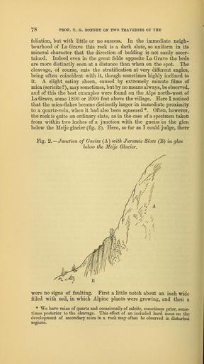 Keywords: The Quarterly journal of the Geological Society of London (13936948132).jpg 80 <br> PEOF T G B01TOEY OST TWO TEAVEESES OF THE <br> On arriving at that point we spent a considerable time in vainly <br> endeavouring to strike the northern edge of this massif thongh we <br> saw the rock at a distance across a valley Our failure was I believe <br> caused by a slight misunderstanding of our map which was on a <br> small scale and not in much detail Thus we missed the only <br> place where the massif as I now <br> see can without much trouble be <br> reached from the highroad We <br> saw however some scattered frag- <br> ments which were mainly gabbro as <br> above described <br> Jurassic limestone often dark in <br> colour extends to the commence- <br> ment of the steeper part of the <br> descent towards Italy fig 3 Here <br> it has a high dip 75° or more to <br> the W N W Beneath a thick con- <br> spicuous mass of this rock comes a <br> calcareous deposit of uncertain nature <br> not unlike a tufa to which succeeds <br> a dull-green serpentine rendered very <br> schistose by crushing Its rude <br> cleavage - structure appears to be <br> roughly parallel with the bedding of <br> the dark limestone To th e serpentine <br> of which there is a rather thick mass <br> succeeds a lead-coloured rather cal- <br> careous mica-schist also intensely <br> crushed the resulting structure being <br> parallel with that in the serpentine <br> This much resembles some members <br> when highly crushed of the Tcalk- <br> haltige grauer ScJiiefer of the Central <br> Alps The two rocks may be seen <br> near together but in the neighbour- <br> hood of the road we could not find an <br> actual junction Between this place <br> and Cesanne we saw in situ only <br> varieties of this crushed mica-schist <br> and below the village is more of the <br> same rock rather darker in colour <br> and somewhat more calcareous its <br> dominant structure which dips to the <br> S W at a moderate angle being the <br> result of subsequent pressure Ap- <br> pendix p 103 <br> Part of the ' Gypse et carnegules ' Trias of Prof Lory's map 36939861 113696 51125 Page 78 Text 45 http //www biodiversitylibrary org/page/36939861 1889 Geological Society of London Biodiversity Heritage Library The Quarterly journal of the Geological Society of London v 45 1889 Geology Periodicals Smithsonian Libraries bhl page 36939861 dc identifier http //biodiversitylibrary org/page/36939861 smithsonian libraries Information field Flickr posted date ISOdate 2014-04-21 Check categories 2015 August 26 CC-BY-2 0 BioDivLibrary https //flickr com/photos/61021753 N02/13936948132 2015-08-26 06 52 33 cc-by-2 0 PD-old-70-1923 The Quarterly journal of the Geological Society of London 1889 Photos uploaded from Flickr by Fæ using a script |