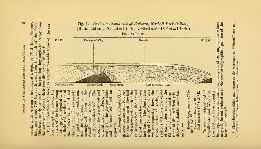 Keywords: The Quarterly journal of the Geological Society of London (13959994793).jpg ROCKS OE THE LEICESTERSHIRE COAL-FIELD 7 <br> able denudation prior to the deposition of the Bunter and that the <br> phenomena cannot be explained by contemporaneous erosion This <br> section in fact exhibits in a very beautiful manner a double uncon- <br> formity and clearly proves that we may without doubt refer the <br> series of strata to which the Breccias belong to the Permian ; for <br> they are not stratigraphically connected either with the Carboniferous <br> or with the Trias <br> Swadlincote fig 3 and PI I ” The stratigraphical break between <br> the Permians of the Leicestershire Coal-field and the Trias is still <br> more strikingly evidenced by an exposure in an open-working at <br> Swadlincote about 1 mile north-west of the section last described <br> The pit has been excavated for the purpose of procuring fire-clay <br> and is 750 yards south-east of Swadlincote Station This is the <br> exposure referred to by Mr W S Gresley F G S in his paper On <br> the Occurrence of Possiliferous Haematite Nodules in the Permian <br> Breccia of Leicestershire ' Midland Naturalist ' vol ix 1886 <br> The ridge of ground on the side of which the pit is situated is <br> correctly shown on the one-inch Survey maps as an outlier of Bunter <br> Conglomerate The magnificent section is from 70 to 80 ft <br> in height and shows about 8 ft of horizontally bedded Bunter <br> Conglomerates of the usual type of the district resting upon about <br> 26 ft of Permian beds made up of sandstones breccias and marls <br> The Permians together with the underlying Coal-measure clays and <br> their associated coal-seams dip into the side of the hill at an angle of <br> 23° in a direction N 50° E so that the unconformity between the <br> Trias and the underlying beds is most striking <br> That there is any great break between the Coal-measures and <br> the Permian in this section is not very apparent at first sight as <br> both seem to dip at the same angle of 23° ; but since the section is <br> almost along the line of strike it is possible that there may be a little <br> discordance of dip which is not evident in the present state of the <br> excavation The unconformity in this case is however indicated <br> clearly by the abrupt change in the lithological characters of the <br> beds and by the occurrence at the line of junction of an eroded <br> and impersistent bed of hard fine-grained Coal-measure sandstone <br> cank <br> The following are details of the section as taken in July 1886 ; <br> but since that time the face of the excavation has been carried some <br> yards further into the hill thus exposing a considerable thickness of <br> Lower Keuper Sandstones and Marls above the Bunter Conglomerate <br> besides showing a considerably greater thickness of Permian and <br> rendering still more evident the distinct break between this series <br> of rocks and the Coal-measures 36939802 113696 51125 Page 5 Text 45 http //www biodiversitylibrary org/page/36939802 1889 Geological Society of London Biodiversity Heritage Library The Quarterly journal of the Geological Society of London v 45 1889 Geology Periodicals Smithsonian Libraries bhl page 36939802 dc identifier http //biodiversitylibrary org/page/36939802 smithsonian libraries Information field Flickr posted date ISOdate 2014-04-21 Check categories 2015 August 26 CC-BY-2 0 BioDivLibrary https //flickr com/photos/61021753 N02/13959994793 2015-08-26 06 53 56 cc-by-2 0 PD-old-70-1923 The Quarterly journal of the Geological Society of London 1889 Photos uploaded from Flickr by Fæ using a script |