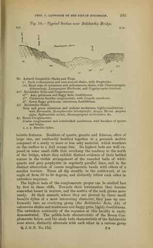 | Keywords: The Quarterly journal of the Geological Society of London (13860395994).jpg PROF C LAPWORTH ON THE GIRVAN SUCCESSION <br> 585 <br> S E <br> Fig 14 Typical Section near Balclatchie Bridge <br> N W <br> Ba Ardwell Graptolitic Shales and Flags <br> a 1 Dark carbonaceous and iron-stained shales with Graptolites <br> n Basal zone of calcareous and carbonaceous shales with Climacograptus <br> Scharenbergi Lasiograptus HarJcnessi and Cryptograptits tricornis <br> Ad 2 Balclatchie Grits and Conglomerate <br> d 2 ' Ashy gritstones and flaggy beds fossiliferous <br> d 2 Calcareous boulder conglomerate with Lingula canadensis <br> d 2 ' Green flaggy gritstones calcareous fossiliferous <br> Ad 1 Balclatchie Shales <br> Grey and green calcareous and nodular mi idstones highly fossiliferous <br> with Barrandia Remopleurides laterispinifer Ampyx Hornei Asapkus <br> gigas Siphonotreta micula Bicranograptus tardwscidus c <br> Ac Benan Conglomerate <br> Coarse conglomerate and interbedded sandstones with boulders of quartz <br> and felsite <br> Basaltic dykes <br> teristic features Boulders of quartz granite and felstone often of <br> large size are confusedly huddled together in a greenish matrix <br> composod of a sandy or more or less ashy material which weathers <br> on the surface to a dull orange tint Its highest beds are well ex- <br> posed in some small cliffs that overhang the roadway to the north <br> of the bridge where they exhibit distinct evidence of their bedded <br> nature in the visible arrangement of the rounded balls of white <br> quartz and grey porphyrite in regularly parallel lines and in the <br> distinct alternation of coarse conglomeratic bands with others of a <br> sandier texture These all dip steadily to the northward at an <br> angle of from 50 to 60 degrees and distinctly follow each other in <br> unbroken sequence <br> The highest beds of the conglomerate proper can be studied foot <br> by foot in these cliffs Towards their termination they become <br> somewhat looser in texture and the matrix of the rock grows more <br> sandy At their summit where they are pierced by three small <br> basaltic dykes of a most interesting character they pass up con- <br> formably into an overlying group the Balclatchie Beds Ad of <br> calcareous shales and mudstones and flaggy grits highly fossiliferous <br> The unbroken continuity of the sequence at this locality is easily <br> demonstrated The pebble-beds characteristic of the Benan Con- <br> glomerate below and the shaly beds characteristic of the Balclatchie <br> zone above distinctly alternate with each other in a curious group <br> Q J G S No 152 2r 36936414 113692 51125 Page 585 Text 38 http //www biodiversitylibrary org/page/36936414 1882 Geological Society of London NameFound Ampyx NameConfirmed Ampyx EOLID 4320587 NameBankID 2875646 NameFound Barrandia NameConfirmed Barrandia EOLID 4325024 NameBankID 2875743 NameFound Climacograptus NameConfirmed Climacograptus EOLID 4724508 NameBankID 6568305 NameFound Graptolites NameConfirmed Graptolites NameBankID 423327 NameFound Lasiograptus NameConfirmed Lasiograptus NameBankID 4214571 NameFound Lingula canadensis NameFound Remopleurides NameConfirmed Remopleurides EOLID 4320706 NameBankID 2875677 NameFound Siphonotreta micula NameConfirmed Siphonotreta micula McCoy Biodiversity Heritage Library The Quarterly journal of the Geological Society of London v 38 1882 Geology Periodicals Smithsonian Libraries bhl page 36936414 dc identifier http //biodiversitylibrary org/page/36936414 smithsonian libraries Information field Flickr posted date ISOdate 2014-04-15 Check categories 2015 August 26 CC-BY-2 0 BioDivLibrary https //flickr com/photos/61021753 N02/13860395994 2015-08-26 07 57 55 cc-by-2 0 PD-old-70-1923 The Quarterly journal of the Geological Society of London 1882 Photos uploaded from Flickr by FĂŚ using a script |