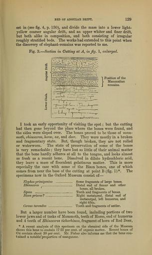 Keywords: The Quarterly journal of the Geological Society of London (13860096104).jpg BED OP ALULAE DEIFT <br> 129 <br> set in see fig 4 p 130 and divide the mass into a lower light- <br> yellow coarser angular drift and an upper whiter and finer drift <br> but both alike in composition and both consisting of irregular <br> roughly stratified beds The works had extended to this point when <br> the discovery of elephant-remains was reported to me <br> Fig 3 ” Section in Cutting at A in fig 1 enlarged <br> j Position of the <br> y Mammalian <br> I took an early opportunity of visiting the spot ; but the cutting <br> had then gone beyond the place where the bones were found and <br> the sides were sloped over The bones proved to be those of mam- <br> moth rhinoceros horse ox and deer They were mostly in a broken <br> and fragmentary state Eut though broken they are not rolled <br> or waterworn The state of preservation of some of the bones <br> is very remarkable ; they have lost so little of their animal matter <br> that the bone hardly adheres at all to the tongue and looks almost <br> as fresh as a recent bone Dissolved in dilute hydrochloric acid <br> they leave a mass of flocculent gelatinous matter This is more <br> especially the case with some of the Bison bones one of which <br> comes from near the base of the cutting at point B fig 1 The <br> specimens now in the Oxford Museum consist of ” <br> Elephas primigenius <br> Rhinoceros <br> Some fragments of large bones <br> Distal end of femur and other <br> bones all broken <br> Equus Teeth and fragments of bones <br> Bison priscus Eight metatarsal distal end of <br> metacarpal left humerus and <br> right tibia <br> Cervus tarandus Tooth and fragments of antler <br> But a larger number have been found including portions of two <br> lower jaws and of tusks of Mammoth teeth of Horse end of humerus <br> and 4 teeth of Rhinoceros tichorhinus fragment of horn of Bed Deer <br> A recent analysis of this specimen on the chemical side of the Museum <br> shows this bone to contain 17 '35 per cent of organic matter Recent bones of <br> Ox contain about 30 per cent Mr Fisher also informs me that the bone con- <br> t ained a notable proportion of manganese 36935900 113692 51125 Page 129 Text 38 http //www biodiversitylibrary org/page/36935900 1882 Geological Society of London NameFound Bison priscus NameConfirmed Bison priscus EOLID 4447747 NameBankID 5570836 NameFound Cervus Tarandus NameConfirmed Cervus tarandus NameBankID 2483932 NameFound Elephas primigenius NameConfirmed Elephas primigenius NameBankID 5716812 NameFound Equus NameConfirmed Equus EOLID 11018612 NameBankID 2478623 Biodiversity Heritage Library The Quarterly journal of the Geological Society of London v 38 1882 Geology Periodicals Smithsonian Libraries bhl page 36935900 dc identifier http //biodiversitylibrary org/page/36935900 smithsonian libraries Information field Flickr posted date ISOdate 2014-04-15 Check categories 2015 August 26 CC-BY-2 0 BioDivLibrary https //flickr com/photos/61021753 N02/13860096104 2015-08-26 07 53 51 cc-by-2 0 PD-old-70-1923 The Quarterly journal of the Geological Society of London 1882 Photos uploaded from Flickr by Fæ using a script |