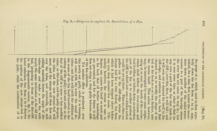 | Keywords: The Quarterly journal of the Geological Society of London (13369164983).jpg 452 <br> PROCEEDINGS OF THE GEOLOGICAL SOCIETY May 28 <br> the gorge at a which used to flow regu- <br> larly clown the fan from a to d may <br> indeed for a time flow nearer the moun- <br> tains down another of the radial water- <br> courses to a part of the fan- edge where <br> the river has not eaten its way in; but <br> it is sure some time or other to find its <br> way over a part of the fan that leads to <br> the cliff ; Yover this then it will fall ; and <br> it will soon cut a channel for itself in the <br> cliff-edge and continue to cut back that <br> channel so as to modify the shape of its <br> bed as far back as a or even further into <br> the ravine itself This action however <br> may be interrupted by some cause origin- <br> ating at or near the mouth of the ravine <br> which shall deflect the river-course and <br> lead it either as before down an unbroken <br> part of the fan or to another portion of <br> the cliff in which last case a similar action <br> would be set up there Thus we often see <br> gullies cut in the cliff-edge where the <br> stream had for a time flowed but from <br> which it had been stopped above before <br> any very deep channel was made Ulti- <br> mately however the stream is sure to <br> deepen one course for itself so much and <br> so far back that all further wanderings <br> are prevented and for the future it will <br> flow out along a deep gully between cliffs <br> of the fan-alluvium <br> Yet another effect is produced over <br> this newly cut gully while it is forming <br> will come with the water the usual de- <br> tritus ; and that will with the addition of <br> the waste of the fan itself involved in the <br> cutting of the gully fall and settle at the <br> foot of the cliff in a more or less modified <br> talus ; as this rises and the gully deepens <br> the talus and the new stream-bed will <br> meet and the stream will then flow out <br> over the talus and eventually by still <br> adding material lessen the angle of the <br> talus-slope and make a new fan with <br> nearly the same inclination as the old one <br> had projecting in front of the fan-cliff <br> In the diagrammatic section fig 8 the <br> lower unbroken line from a to b denotes <br> the position of the new stream-bed in <br> the gully while the continuation of it 39051390 120601 51125 Page 452 Text v 29 http //www biodiversitylibrary org/page/39051390 1873 Geological Society of London Biodiversity Heritage Library The Quarterly journal of the Geological Society of London v 29 1873 Geology Periodicals Smithsonian Libraries bhl page 39051390 dc identifier http //biodiversitylibrary org/page/39051390 smithsonian libraries Information field Flickr posted date ISOdate 2014-03-24 Check categories 2015 August 26 CC-BY-2 0 BioDivLibrary https //flickr com/photos/61021753 N02/13369164983 2015-08-26 10 56 00 cc-by-2 0 PD-old-70-1923 The Quarterly journal of the Geological Society of London 1873 Photos uploaded from Flickr by Fæ using a script |