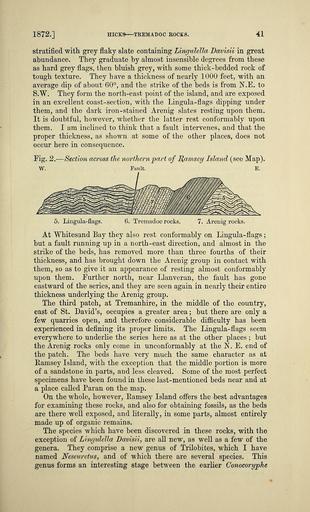 | Keywords: The Quarterly journal of the Geological Society of London (13368714145).jpg 1872 <br> HICKS- TREMADOC ROCKS <br> 41 <br> stratified with grey flaky slate containing LinguleUa Davisii in great <br> abundance They graduate by almost insensible degrees from these <br> as hard grey flags then bluish grey with some thick-bedded rock of <br> tough texture They have a thickness of nearly 1000 feet with an <br> average dip of about 60° and the strike of the beds is from N E to <br> S W They form the north-east point of the island and are exposed <br> in an excellent coast-section with the Lingula-fiags dipping under <br> them and the dark iron-stained Arenig slates resting upon them <br> It is doubtful however whether the latter rest conformably upon <br> them I am inclined to think that a fault intervenes and that the <br> proper thickness as shown at some of the other places does not <br> occur here in consequence <br> Fig 2 Section across the northern part of Ramsey Island see Map <br> W Fault E <br> 5 Lingula-flags <br> 6 Tremadoc rocks <br> 7 Arenig rocks <br> At Whitesand Bay they also rest conformably on Lingula-flags ; <br> but a fault running up in a north-east direction and almost in the <br> strike of the beds has removed more than three fourths of their <br> thickness and has brought down the Arenig group in contact with <br> them so as to give it an appearance of resting almost conformably <br> upon them Further north near Llanveran the fault has gone <br> eastward of the series and they are seen again in nearly their entire <br> thickness underlying the Arenig group <br> The third patch at Tremanhire in the middle of the country <br> east of St David's occupies a greater area ; but there are only a <br> few quarries open and therefore considerable difficulty has been <br> experienced in defining its proper limits The Lingula-flags seem <br> everywhere to underlie the series here as at the other places ; but <br> the Arenig rocks only come in unconformably at the N E end of <br> the patch The beds have very much the same character as at <br> Ramsey Island with the exception that the middle portion is more <br> of a sandstone in parts and less cleaved Some of the most perfect <br> specimens have been found in these last-mentioned beds near and at <br> a place called Paran on the map <br> On the whole however Ramsey Island offers the hest advantages <br> for examining these rocks and also for obtaining fossils as the beds <br> are there well exposed and literally in some parts almost entirely <br> made up of organic remains <br> The species which have been discovered in these rocks with the <br> exception of LinguleUa Davisii are all new as well as a few of the <br> genera They comprise a new genus of Trilobites which I have <br> named Neseurctus and of which there are several species This <br> genus forms an interesting stage between the earlier Conocoryphe 39050887 120601 51125 Page 41 Text v 29 http //www biodiversitylibrary org/page/39050887 1873 Geological Society of London NameFound Conocoryphe NameConfirmed Conocoryphe EOLID 4320747 NameBankID 2875722 Biodiversity Heritage Library The Quarterly journal of the Geological Society of London v 29 1873 Geology Periodicals Smithsonian Libraries bhl page 39050887 dc identifier http //biodiversitylibrary org/page/39050887 smithsonian libraries Information field Flickr posted date ISOdate 2014-03-24 Check categories 2015 August 26 CC-BY-2 0 BioDivLibrary https //flickr com/photos/61021753 N02/13368714145 2015-08-26 10 50 32 cc-by-2 0 PD-old-70-1923 The Quarterly journal of the Geological Society of London 1873 Photos uploaded from Flickr by FÌ using a script |