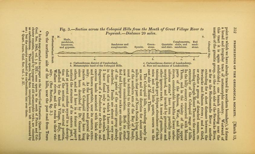 | Keywords: The Quarterly journal of the Geological Society of London (13365526403).jpg 352 PROCEEDINGS OF THE GEOLOGICAL SOCIETY March 13 <br> Cobequid Bay <br> I <br> CO <br> 5 <br> 111 <br> a§ <br> 5S <br> 1 <br> CO u <br> point to which we have already traced its southern boundary it forms <br> a broad and irregular tract of metamorphic country Westward of <br> this tract it is again subdivided ; one branch extending near the <br> margin of the granitic group on the south side of the Stewiacke Riyer <br> as far as the Shubenacadie River ; another <br> extending for a short distance between the <br> Stewiacke and Salmon rivers ; and a third <br> or rather a group of detached masses ex- <br> tending through Mount Thom to the eastern <br> extremity of the Cobequid range of hills <br> In the hilly country connected with Moimt <br> Thom and in the vicinity of the upper <br> parts of the Salmon West and Middle <br> rivers considerable breadths of lower carbo- <br> niferous strata' have been partially meta- <br> morphosed and invaded by greenstone and <br> other igneous rocks A mass of granite con- <br> taining dark grey felspar abundance of black <br> mica and very little quartz occurs on the <br> east side of Mount Thom <br> The Cobequid hiUs extending nearly in <br> an east and west direction for about ninety <br> miles in that part of Nova Scotia h ing north <br> of the southern ami of the Bay of Fundy <br> must be referred to the metamorphic group <br> now under consideration Both its strati- <br> fied and hypogene rocks are similar to those <br> of the parts of the syenitic group already <br> described Fossils are absent or veiy rare <br> in those parts of it which I have explored <br> I have found only a few fish-scales and <br> fragments of a Productus or Orthis in cal- <br> careous bands associated with black slate <br> and brown quaitzite near its eastern extre- <br> mity As the boundaries and general cha- <br> I g racters of the Cobequid range have long <br> since been described by Dr Gesner and <br> others and as I have in a former paper f <br> noticed the structm-e of its eastern part I <br> shall at present confine myself to a descrip- <br> tion of the section of its central portion <br> afforded by the Great Tillage Folly and <br> Wallace rivers and the roads in their vici- <br> nity See Section fig 3 <br> On the northern side of the hills near the post road from Truro <br> - £ c <br> li <br> II <br> Northumberland Strait <br> In the map attached to my paper on the Newer Coal Formation Quart Journ <br> Geol Soc 1845 vol i p 322 some spaces in the south of Pictou and Col- <br> chester counties occupied by hypogene and old metamorphic rocks are coloured <br> as carboniferous These spaces being then unexplored were left uncoloured by <br> me ; but the colourist extended the carboniferous tint over them <br> t Quart Journ Geol Soc vol i p 27 36934217 113689 51125 Page 352 Text v 6 http //www biodiversitylibrary org/page/36934217 1850 Geological Society of London NameFound Orthis NameConfirmed Orthis EOLID 4333134 NameBankID 4270859 NameFound Productus NameConfirmed Productus NameBankID 4310929 Biodiversity Heritage Library The Quarterly journal of the Geological Society of London v 6 1850 Geology Periodicals Smithsonian Libraries bhl page 36934217 dc identifier http //biodiversitylibrary org/page/36934217 smithsonian libraries Information field Flickr posted date ISOdate 2014-03-23 Check categories 2015 August 26 CC-BY-2 0 BioDivLibrary https //flickr com/photos/61021753 N02/13365526403 2015-08-26 10 52 01 cc-by-2 0 PD-old-70-1923 The Quarterly journal of the Geological Society of London 1850 Photos uploaded from Flickr by Fæ using a script |