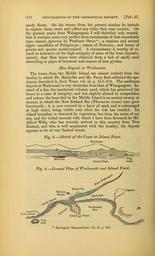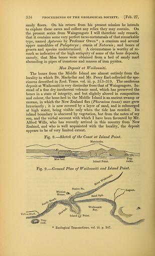 | Keywords: The Quarterly journal of the Geological Society of London (13365496183).jpg 334 PROCEEDINGS OF THE GEOLOGICAL SOCIETY Feb 27 <br> sandy floors On his return from his present mission he intends <br> to explore these caves and collect any relics they may contain On <br> the present series from Waingongoro I will therefore only remark <br> that it contains some very perfect tarso-metatarsals of that remarkable <br> type named Aptornis by Professor Owen ; a cranimn and several <br> upper mandibles of Falapteryx ; crania of Notornis ; and bones of <br> genera and species undetermined A circumstance is worthy of re- <br> mark as indicative of the high antiquity of some of the bone deposits <br> namely that Moa bones were obtained from a bed of sandy marl <br> abounding in pipes of ironstone and masses of iron pyrites <br> Moa Deposit at Waikouaiti <br> The bones from the Middle Island are almost entirely from the <br> locality in which Dr Mackellar and Mr Percy Earl collected the spe- <br> cimens described in Zool Trans vol iii p 313-319 The ossiferous <br> deposit at Waikouaiti is very dissimilar from that of Waingongoro In- <br> stead of a fine dry incoherent volcanic sand which has preserved the <br> bones in a state of integrity and but slightly altered in composition <br> and colour the bone-bed in the Middle Island is an ancient swamp or <br> morass in which the New Zealand flax Phormium tenax once grew <br> luxuriantly ; it is now covered by a layer of sand and is submerged <br> at high water being visible only when the tide has receded Its <br> inland boundary is obscured by vegetation but from the notes of my <br> son and the verbal account with which I have been favoured by Mr <br> Alfred Wills who has recently arrived in this country from New <br> Zealand and who is well acquainted with the locality the deposit <br> appears to be of very Umited extent <br> Fig 8 ” Sketch of the Coast at Island Point <br> Matainaka <br> Island Point <br> Fig 9 ” Ground Plan of Waikouaiti and Island Point <br> Native Pa <br> Mission <br> House <br> Yellow Bluff <br> Zoological Transactions vol iii p 347 36934195 113689 51125 Page 334 Text v 6 http //www biodiversitylibrary org/page/36934195 1850 Geological Society of London NameFound Aptornis NameConfirmed Aptornis EOLID 4364578 NameBankID 4076364 NameFound Notornis NameConfirmed Notornis Owen 1848 EOLID 33387 NameFound Phormium tenax NameConfirmed Phormium tenax EOLID 1015114 NameBankID 3876664 Biodiversity Heritage Library The Quarterly journal of the Geological Society of London v 6 1850 Geology Periodicals Smithsonian Libraries bhl page 36934195 dc identifier http //biodiversitylibrary org/page/36934195 smithsonian libraries Information field Flickr posted date ISOdate 2014-03-23 Check categories 2015 August 26 CC-BY-2 0 BioDivLibrary https //flickr com/photos/61021753 N02/13365496183 2015-08-26 10 55 36 cc-by-2 0 PD-old-70-1923 The Quarterly journal of the Geological Society of London 1850 Photos uploaded from Flickr by Fæ using a script |