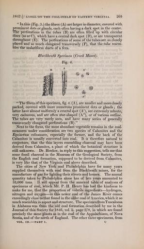 Keywords: The Quarterly journal of the Geological Society of London (13205997113).jpg IS47 <br> LYELL ON THE COAL-FIELD OF EASTERN VIRGINIA <br> 269 <br> In this Fig 3 the fibres A are larger in diameter covered with <br> prominent dots or glands each often having a dark spot in the centre <br> The perforations in the tubes B are often filled up with circular <br> discs as at C which have a central dark spot D or are transparent <br> throughout E The perforations of some of the tubes are so closely <br> placed and so much elongated transversely F that the tube resem- <br> bles the scalariform ducts of a fern <br> Blackheath Specimen Creek Mines <br> Fig 4 <br> The fibres of this specimen fig 4 A are smaller and moreclosely <br> packed covered with more numerous prominent dots or glands ; the <br> latter have almost uniformly a central spot A' are extremely minute <br> very caducous and are often star-shaped A or of various outline <br> The tubes are very rarely seen and have many series of generally <br> transversely elongated perforations B <br> Next to the ferns the most abundant vegetable remains in the coal- <br> measures under consideration are two species of Calamites and the <br> Eqiiisetum columnare especially the former and the bark of the <br> Calamites is usually converted into coal It is therefore natural to <br> conjecture that the thin layers resembling charcoal may have been <br> derived from Calamites a plant of which the botanical structure is <br> still unknown Dr Hooker in reply to this suggestion tells me that <br> some fossil charcoal in the Museum of the Geological Society from <br> the English coal formation supposed to be derived from Calamites <br> is very like that of the Virginia coal above described <br> The cities of New York and Philadelphia have for many years <br> supplied themselves with coal from the Blackheath mines for the <br> manufacture of gas for lighting their streets and houses The annual <br> quantity taken by Philadelphia alone has of late years amounted to <br> 10 000 tons It will appear from the annexed table of analyses of <br> specimens of coal which Mr P H Henry has had the kindness to <br> make for me that the proportion of volatile ingredients ” hydrogen <br> nitrogen and oxygen ” in this newer coal of the James River comes <br> exceedingly close to that found in the older coal of America which it so <br> much resembles in aspect and structure The specimen from Tuscaloosa <br> in Alabama was from the old coal formation described by me in the <br> Journal of this Society for 1846 vol ii page 2/8 in which are found <br> precisely the same plants as in the coal of the Appalachians of Nova <br> Scotia and of the north of England The other three specimens from <br> VOL III PART I U 36933008 113687 51125 Page 269 Text v 3 http //www biodiversitylibrary org/page/36933008 1847 Geological Society of London NameFound Calamites NameConfirmed Calamites EOLID 13132177 NameBankID 4098476 NameFound Eqiiisetum columnare NameFound Tuscaloosa Biodiversity Heritage Library The Quarterly journal of the Geological Society of London v 3 1847 Geology Periodicals Smithsonian Libraries bhl page 36933008 dc identifier http //biodiversitylibrary org/page/36933008 smithsonian libraries Information field Flickr posted date ISOdate 2014-03-17 Check categories 2015 August 26 CC-BY-2 0 BioDivLibrary https //flickr com/photos/61021753 N02/13205997113 2015-08-26 12 53 28 cc-by-2 0 PD-old-70-1923 The Quarterly journal of the Geological Society of London 1847 Photos uploaded from Flickr by Fæ using a script |