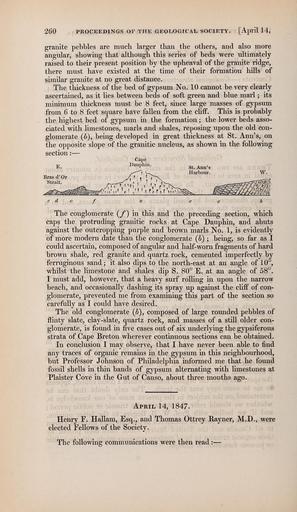 Keywords: The Quarterly journal of the Geological Society of London (13206154384).jpg 260 PROCEEDINGS OF THE GEOLOGICAL SOCIETY April 14 <br> granite pebbles are much larger than the others and also more <br> angular showing that although this series of beds were ultimately <br> raised to their present position by the upheaval of the granite ridge <br> there must have existed at the time of their formation hills of <br> similar granite at no great distance <br> The thickness of the bed of gypsum No 10 cannot be very clearly <br> ascertained as it lies between beds of soft green and blue marl ; its <br> minimum thickness must be 8 feet since large masses of gypsum <br> from 6 to 8 feet square have fallen from the cliff This is probably <br> the highest bed of gypsum in the formation ; the lower beds asso- <br> ciated with limestones marls and shales reposing upon the old con- <br> glomerate 6 being developed in great thickness at St Ann's on <br> the opposite slope of the granitic nucleus as shown in the following <br> section ” <br> Cape <br> p Dauphin <br> The conglomerate / in this and the preceding section which <br> caps the protruding granitic rocks at Cape Dauphin and abuts <br> against the outcropping purple and brown marls No 1 is evidently <br> of more modern date than the conglomerate 6 ; being so far as I <br> could ascertain composed of angular and half-worn fragments of hard <br> brown shale red granite and quartz rock cemented imperfectly by <br> ferruginous sand ; it also dips to the north-east at an angle of 1 0° <br> whilst the limestone and shales dip S 80° E at an angle of 58° <br> I must add however that a heavy surf rolHng in upon the narrow <br> beach and occasionally dashing its spray up against the chff of con- <br> glomerate prevented me from examining this part of the section so <br> carefully as I could have desired <br> The old conglomerate 5 composed of large rounded pebbles of <br> flinty slate clay-slate quartz rock and masses of a still older con- <br> glomerate is found in five cases out of six underlying the gypsiferous <br> strata of Cape Breton wherever continuous sections can be obtained <br> In conclusion I may observe that I have never been able to find <br> any traces of organic remains in the gypsum in this neighbourhood <br> but Professor Johnson of Philadelphia informed me that he found <br> fossil shells in thin bands of gypsum alternating with limestones at <br> Plaister Cove in the Gut of Canso about three months ago <br> April 14 1847 <br> Henry F Hallam Esq and Thomas Ottrey Rayner M D were <br> elected Fellows of the Society <br> The following communications were then read ” 36932999 113687 51125 Page 260 Text v 3 http //www biodiversitylibrary org/page/36932999 1847 Geological Society of London Biodiversity Heritage Library The Quarterly journal of the Geological Society of London v 3 1847 Geology Periodicals Smithsonian Libraries bhl page 36932999 dc identifier http //biodiversitylibrary org/page/36932999 smithsonian libraries Information field Flickr posted date ISOdate 2014-03-17 Check categories 2015 August 26 CC-BY-2 0 BioDivLibrary https //flickr com/photos/61021753 N02/13206154384 2015-08-26 12 55 19 cc-by-2 0 PD-old-70-1923 The Quarterly journal of the Geological Society of London 1847 Photos uploaded from Flickr by Fæ using a script