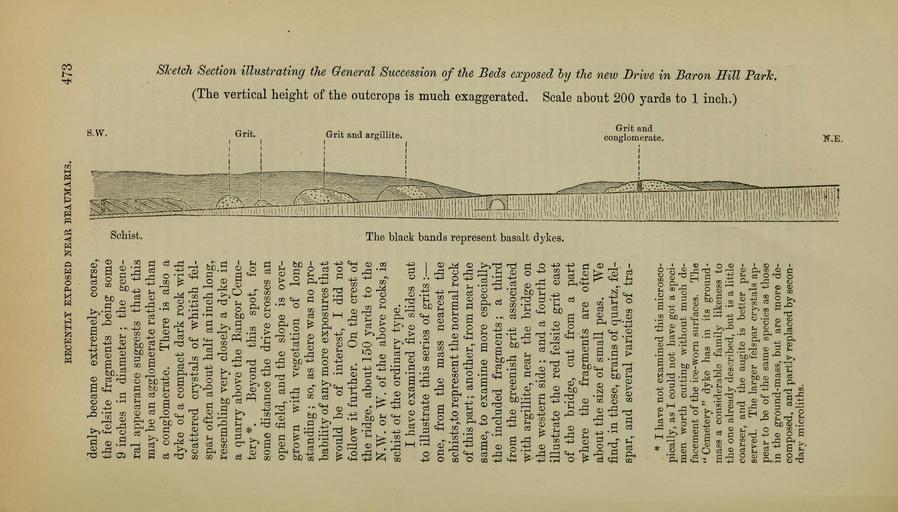 | Keywords: The Quarterly journal of the Geological Society of London (13204972153).jpg RECENTLY EXPOSED NEAR BEAUMARIS <br> 473 <br> denly became extremely coarse <br> the felsite fragments being some <br> 9 inches in diameter ; the gene- <br> ral appearance suggests that this <br> may be an agglomerate rather than <br> a conglomerate There is also a <br> dyke of a compact dark rock with <br> scattered crystals of whitish fel- <br> spar often about half an inch long <br> resembling very closely a dyke in <br> a quarry above the Bangor Ceme- <br> tery Beyond this spot for <br> some distance the drive crosses an <br> open field and the slope is over- <br> grown with vegetation of long <br> standing ; so as there was no pro- <br> bability of any more exposures that <br> would be of interest I did not <br> follow it further On the crest of <br> the ridge about 150 yards to the <br> N W or W of the above rocks is <br> schist of the ordinary type <br> I have examined five slides cut <br> to illustrate this series of grits ” <br> one from the mass nearest the <br> schists to represent the normal rock <br> of this part ; another from near the <br> same to examine more especially <br> the included fragments ; a third <br> from the greenish grit associated <br> with argillite near the bridge on <br> the western side ; and a fourth to <br> illustrate the red felsite grit east <br> of the bridge cut from a part <br> where the fragments are often <br> about the size of small peas We <br> find in these grains of quartz fel- <br> spar and several varieties of tra- <br> I hare not examined this microsco- <br> pically as I could not have got a speci- <br> men worth cutting without much de- <br> facement of the ice-worn surfaces The <br> Cemetery dyke lias in its ground- <br> mass a considerable family likeness to <br> the one already described but is a little <br> coarser and the augite is better pre- <br> served The larger felspar crystals ap- <br> pear to be of the same species as those <br> in the ground-mass but are more de- <br> composed and partly replaced by secon- <br> dary microliths <br> CD <br> CD <br> O <br> e-K <br> O <br> H <br> CD <br> M <br> P <br> cr <br> en <br> CD <br> P <br> to <br> o <br> o <br> M <br> P <br> <br> a <br> m <br> o <br> CD <br> 5M <br> 36929086 113681 51125 Page 473 Text 39 http //www biodiversitylibrary org/page/36929086 1883 Geological Society of London Biodiversity Heritage Library The Quarterly journal of the Geological Society of London v 39 1883 Geology Periodicals Smithsonian Libraries bhl page 36929086 dc identifier http //biodiversitylibrary org/page/36929086 smithsonian libraries Information field Flickr posted date ISOdate 2014-03-16 Check categories 2015 August 26 CC-BY-2 0 BioDivLibrary https //flickr com/photos/61021753 N02/13204972153 2015-08-26 12 52 33 cc-by-2 0 PD-old-70-1923 The Quarterly journal of the Geological Society of London 1883 Photos uploaded from Flickr by Fæ using a script |