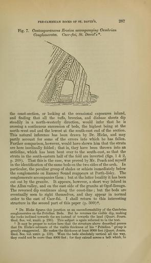 Keywords: The Quarterly journal of the Geological Society of London (13204715765).jpg PEE-CAMBRIAN EOCKS OF ST DAVID S <br> 287 <br> Fig 7 Contemporaneous Erosion accompanying Cambrian <br> Conglomerates Caer-fai St David's <br> the coast-section or looking at the occasional exposures inland <br> and finding that all the tuffs breccias and diabase sheets dip <br> steadily in a north-westerly direction would infer that he is <br> crossing a continuous succession of beds the highest being at the <br> north-west end and the lowest at the south-east end of the section <br> This natural inference has been drawn by Dr Hicks and may <br> partly account for some of the errors into which he has fallen <br> Further comparison however would have shown him that the strata <br> are here isoclinally folded ; that is they have been thrown into an <br> anticline which has been bent over to the south-east so that the <br> strata in the south-eastern half of the fold are inverted figs 1 2 <br> p 268 That this is the case was proved by Mr Peach and myself <br> in the identification of the same beds on the two sides of the arch In <br> particular the peculiar group of shales or schists immediately below <br> the conglomerate on Ramsey Sound reappears at Porth-lisky The <br> conglomerate accompanies them ; but at the latter locality it has been <br> cut out by the granite It appears however a short way inland in <br> the Allan valley and on the east side of the granite at Ogof-llesugn <br> The reversed dip continues along the coast-line ; but the beds are <br> eventually seen to right themselves and they appear in normal <br> order to the east of Caer-fai I shall return to this interesting <br> structure in the second part of this paper p 309 f <br> Dr Hicks figures this junction as an unconformability of the Cambrian <br> conglomerates on the Pebidian Beds But he reverses the visible dip making <br> tbe rocks inclined towards the sea instead of towards the land Quart Journ <br> Geol Soc vol xxxiii p 236 This subject is again referred to in the text <br> t It may be proper to notice here that the structure above described proves <br> that Dr Hicks's estimate of the visible thickness of his Pebidian group is <br> greatly exaggerated He makes the thickness at least 8000 feet Quart Journ <br> Geol Soc vol xxxiv p 159 Were the beds absolutely vertical all the way <br> they could not be more than 4000 feet ; for they extend across a belt which to 36928886 113681 51125 Page 287 Text 39 http //www biodiversitylibrary org/page/36928886 1883 Geological Society of London Biodiversity Heritage Library The Quarterly journal of the Geological Society of London v 39 1883 Geology Periodicals Smithsonian Libraries bhl page 36928886 dc identifier http //biodiversitylibrary org/page/36928886 smithsonian libraries Information field Flickr posted date ISOdate 2014-03-16 Check categories 2015 August 26 CC-BY-2 0 BioDivLibrary https //flickr com/photos/61021753 N02/13204715765 2015-08-26 13 55 24 cc-by-2 0 PD-old-70-1923 The Quarterly journal of the Geological Society of London 1883 Photos uploaded from Flickr by Fæ using a script |