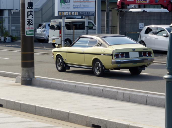 Keywords: The rearview of Mitsubishi Colt Galant GTO.JPG ja 三菱・コルトギャランGTOをリアから撮影 2014-09-14 15 19 17 own Tokumeigakarinoaoshima cc-zero Uploaded with UploadWizard Mitsubishi Colt Galant Yellow coupes