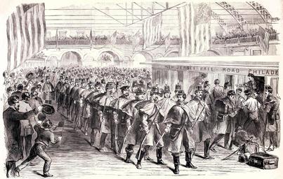 Keywords: snow (from Frank Leslie's Illustrated History of the Civil War..., edited by Louis Shepheard Moat, Published by Mrs. Frank Leslie, New York, 1895) "Thousands of patriotic citizens filled every available space in the big railroad station in Jersey City when the Sixth Regiment of Massachusetts entered, on its way to defend the Capital, Washington, April 18th, 1861, after marching through the streets of New York. The people enthusiastically cheered the soldiers and wished them a safe journey as they boarded the waiting train. The regiment was composed of eight hundred men. This was the regiment which, upon its arrival in Baltimore, was stoned and shot at by a mob of Southern men who attempted to stop its progress to Washington." (from Frank Leslie's Illustrated History of the Civil War..., edited by Louis Shepheard Moat, Published by Mrs. Frank Leslie, New York, 1895) "Thousands of patriotic citizens filled every available space in the big railroad station in Jersey City when the Sixth Regiment of Massachusetts entered, on its way to defend the Capital, Washington, April 18th, 1861, after marching through the streets of New York. The people enthusiastically cheered the soldiers and wished them a safe journey as they boarded the waiting train. The regiment was composed of eight hundred men. This was the regiment which, upon its arrival in Baltimore, was stoned and shot at by a mob of Southern men who attempted to stop its progress to Washington." |