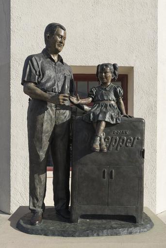 | Keywords: The "Sweet Inspiration" statue outside the Dublin Bottling Works and W.P. Kloster Museum in Dublin, Texas LCCN2015630959.tif 1 photograph digital tiff file color Notes This plant produced a distinctive form of Dr Pepper the in Dr wasn't added until the product was canned a soda popular throughout the South The distinction it used only pure cane sugar and does to this day in several sodas that it bottles on site Dr Pepper was first concocted in Waco Texas and iintroduced as a fountain drink at the world's fair of 1904 in St Louis but it was first bottled at this plant in Dublin The statue depicts Kloster known locally as Mr Dr Pepper and an appreciative young customer; Kloster was a longtime plant manager ; Gift; The Lyda Hill Foundation; 2014; DLC/PP-2014 054 ; Title date and keywords based on information provided by the photographer ; Forms part of Lyda Hill Texas Collection of Photographs in Carol M Highsmith's America Project in the Carol M Highsmith Archive ; Credit line The Lyda Hill Texas Collection of Photographs in Carol M Highsmith's America Project Library of Congress Prints and Photographs Division photo date 2014-09-04 Creator Carol M Highsmith LOC-image highsm 30723 Library of Congress Catalog http //lccn loc gov/2015630959 Image download https //cdn loc gov/master/pnp/highsm/30700/30723a tif Original url http //hdl loc gov/loc pnp/highsm 30723 photo license PD-Highsmith 32 5 0561 0 N 98 20 5596 0 W alt 431_source exif_heading 2000 bronze statues 2000s bronze statues in the United States Statues of standing men Statues of sitting children Dr Pepper Dublin Texas Photographs by Carol M Highsmith Lyda Hill Texas Collection of Photographs in Carol M Highsmith's America Project in the Carol M Highsmith Archive The Lyda Hill Texas Collection of Photographs in Carol M Highsmith's America Project Library of Congress Prints and Photographs Division Images uploaded by Fæ |