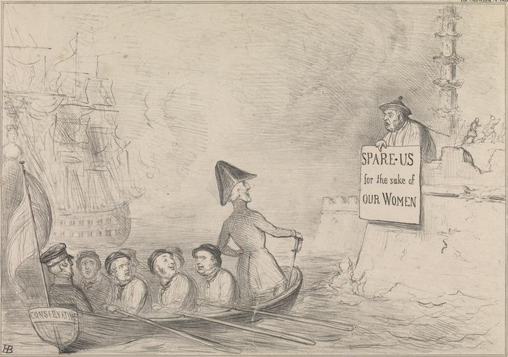 | Keywords: The Taking of Chusan (satire).jpg A satire of the Bedchamber Crisis The assault of the Conservative Party on the Whig government is compared to the British taking of Chusan during the First Opium War 1839-42 It shows Robert Peel in the stern and Wellington in the bow of a man-of-war's boat full of Conservatives approaching a fort on which Viscount Melbourne dressed as a Chinaman hangs a board inscribed Spare Us for the Sake of Our Women In 1839 Viscount Melbourne resigned as Prime Minister and Queen Victoria asked Peel to form a new government However the Conservatives were a minority in the House of Commons and fearing that forming a weak government would damage his future Peel refused unless the Queen purged her ladies of the bedchamber her closest companions many of whom were the wives or daughters of Whig politicians No agreement was reached so Melbourne was persuaded to stay on On 8 December 1840 The Times reported the assault on Chusan On landing the troops found the city and suburbs abandoned by the inhabitants with the exception of one man who was holding up a board with this inscription upon it - 'Save us for the sake of our wives and children' Doyle could not let the opportunity for satire pass The Conservatives continued to make headway and in 1841 Peel got a majority in the General Election replaced Melbourne and removed the Whig ladies As Victoria had married Albert in 1840 she relied on them less and so made no complaint http //www grosvenorprints com/stock_detail php ref 24559 Published 31 December 1840 http //collections rmg co uk/collections/objects/128048 html Creator John Doyle PD-old-100-1923 Capture of Chusan John Doyle Political satire Prints in the National Maritime Museum London |