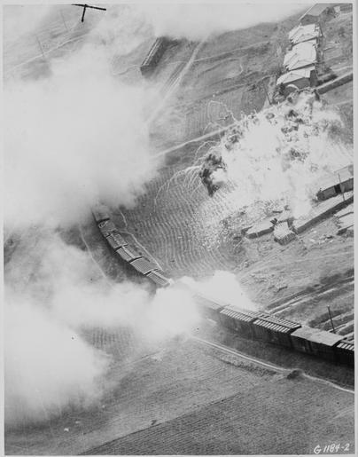 | Keywords: The tank of napalm dropped by Fifth Air Force B-26 Invader light bombers of the 452nd Bomb Wing (light) on this Red... - NARA - 542187.tif Scope and content The tank of napalm dropped by Fifth Air Force B-26 Invader light bombers of the 452nd Bomb Wing light on this Red marshalling yard at Masen-ni North Korea has blended with a stockpile of supplies on a loading platform to from a fiery inferno A rocket which completely pierced a boxcar loaded with supplies has set two others ablaze Other rockets and 50 caliber ammunition has started huge fires in other sections of the railyard Interdiction strikes like this have kept thousands of tons of enemy supplies from reaching frontline troops General notes 542187 Local identifier 342-AF-B80333AC Department of Defense Department of the Air Force 09/26/1947 - Still Picture Records Section Special Media Archives Services Division NWCS-S National Archives at College Park 8601 Adelphi Road College Park MD 20740-6001 ca date 1951 07 11 Record group Record Group 342 Records of U S Air Force Commands Activities and Organizations 1900 - 2003 Record group ARC 654 Black and White Photographs of U S Air Force and Predecessors' Activities Facilities and Personnel Domestic and Foreign compiled 1930 - 1975 documenting the period 1863 - 1975 Series ARC 542185 File unit File unit ARC Variant control numbers Agency-Assigned Identifier NASM 4A 38865<br /> NAIL Control Number NWDNS-342-AF-B80333AC yes Other versions NARA-cooperation PD-USGov Bombing during the Korean War Napalm |