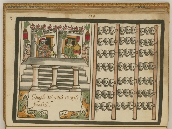 | Keywords: The Temple to the Aztec God Huitzilopochtli WDL6752.png Artwork ru Това Хуан де около 1546 г около 1626 г fr Tovar Jean de 1546-1626 env en Tovar Juan de circa 1546-circa 1626 zh 胡安·德·托瓦尔,约 1546 年 - 约 1626 年 pt Tovar Juan de por volta de 1546-por volta de 1626 ar خوان دو توفار، حوالي 1546-حوالي 1626 es Tovar Juan de circa 1546-circa 1626 ru Х ам в честь ацтекского бога Уицилопочтли fr Le temple du dieu aztèque Huitzilopochtli en The Temple to the Aztec God Huitzilopochtli zh 纪念阿兹特克神慧兹罗波西特利的神庙 pt O templo do deus asteca Huitzilopochtli ar معبد الإله الأزتكي ويتسيلوبوتشتلي ru Кодекс Това а авто ом кото ого считается мексиканский иезуит XVI века Хуан де Това соде жит под обную инфо мацию об об ядах и це емониях ацтеков известных также как мешика Кодекс п оиллюст и ован 51 аква ельным исунком на полную ст аницу Рисунки в кото ых наблюдается значительное влияние пиктог афических укописей доколониальных в емен обладают исключительными художественными достоинствами Рукопись состоит из т ех азделов В пе вом азделе описана исто ия путешествий ацтеков до п ибытия испанцев Вто ой аздел п едставляющий собой иллюст и ованную исто ию ацтеков составляет основной объем укописи В т етьем азделе находится календа ь Това а а этой иллюст ации из вто ого аздела слева изоб ажен х ам или пи амида увенчанный об азами двух богов по бокам от кото ых сидят ко енные мексиканцы Сп ава на х аме изоб ажен Уицилопочтли а слева Тлалок с би юзовой змеей в уках Х ам ок ужен стеной из змей заглатывающих головы д уг д уга Сп ава показана <em>тзомпантли</em> ацтекская подставка для че епов Уицилопочтли имя кото ого означает голубая колиб и левой сто оны был у ацтеков богом солнца и войны Его мистическое о ужие называлось <em> xiuhcoatl </em> би юзовая или огненная змея Тлалок бог дождя и земледелия вел свое п оисхождение от тольтеков п едков ацтеков Х амы ацтеков часто ок ужает <em>coatepantli</em> стена из изваяний змей Тзомпантли п едназначались для че епов Великий х ам в Теночтитлане был увенчан двумя святилищами одно слева было посвящено Тлалоку вто ое сп ава Уицилопочтли <br>Боги ацтеков; Ацтеки; Кодекс; Индейцы ексики; Ко енные на одности; езоаме ика; Х амы; Кодекс Това а fr Le codex Tovar attribué à Jean de Tovar jésuite mexicain du XVI<sup>e</sup> siècle contient des informations détaillées sur les rites et les cérémonies des Aztèques également connus sous le nom de Mexicas Il est illustré de 51 aquarelles de la taille d'une page Fortement influencées par les manuscrits pictographiques de la période précontact ces peintures sont d'une qualité artistique exceptionnelle Le manuscrit est divisé en trois sections La première section contient une histoire des voyages des Aztèques avant l'arrivée des Espagnols La seconde section une histoire illustrée du peuple aztèque constitue la majeure partie du manuscrit La troisième section est constituée du calendrier de Tovar Dans cette illustration extraite de la seconde section deux dieux entourés d'indigènes mexicains sont représentés au-dessus d'un temple ou d'une pyramide à gauche Huitzilopochtli est dessiné à droite du temple et Tlaloc tenant un serpent de turquoise apparaît à gauche Un mur de serpents engloutissant tour à tour leur tête entoure le temple Un <em>tzompantli</em> rangs de crânes aztèques empalés est représenté à droite Huitzilopochtli dont le nom signifie « colibri bleu de gauche » était le dieu aztèque du Soleil et de la guerre Le <em>xiuhcoatl</em> serpent de turquoise ou de feu était son arme mystique D'origine préaztèque ou toltèque Tlaloc était le dieu de la pluie et de l'agriculture Un <em>coatepantli</em> mur de serpents sculptés entoure souvent les temples aztèques Le tzompantli était constitué des crânes des victimes des sacrifices Deux sanctuaires surplombent le grand temple de Tenochtitlan celui de gauche est dédié à Tlaloc et celui de droite à Huitzilopochtli <br>Dieux aztèques; Aztèques; Codex; Indiens du Mexique; Peuples autochtones; Méso-Amérique; Temples; Codex Tovar en The Tovar Codex attributed to the 16th-century Mexican Jesuit Juan de Tovar contains detailed information about the rites and ceremonies of the Aztecs also known as Mexica The codex is illustrated with 51 full-page paintings in watercolor Strongly influenced by pre-contact pictographic manuscripts the paintings are of exceptional artistic quality The manuscript is divided into three sections The first section is a history of the travels of the Aztecs prior to the arrival of the Spanish The second section an