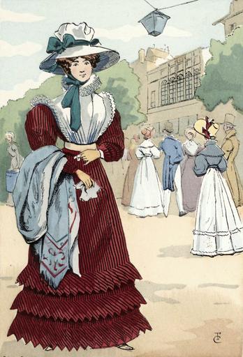 Keywords: The Théatre de Madame, 1827.jpg Artwork The woman depicted in this plate is wearing a red dress with a flounced hem and a fairly low belted waist She has a very high lace collar carries a cashmere shawl and wears a wide-brimmed hat Abstract source Ruppert Jacques Le Costume Français Paris Flammarion 1996 1898 colored plate 10 x 15 cm Institution Brown University Library object history exhibition history credit line Published in Octave Uzanne Fashion in Paris the various phases of feminine taste and aesthetics from 1797 to 1897 London William Heinemann 1898 accession number 1150467297528077 PD-old Les modes de Paris 038 Images of Paris from the Brown University Library Théâtre du Gymnase Marie-Bell 1827 in Paris Fashion in 1827 Females with red dresses in art 1820s dresses |