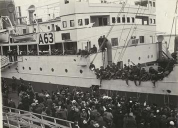 Keywords: soldiers men wwi first world war firstworldwar troops troopship hospital ship hospitalship karoola melbourne soldier australian imperial force australianimperialforce australian troops australiantroops australian troops go to war australiantroopsgotowar By Melbourne photographer Josiah E Barnes of the troopship KAROOLA leaving Melbourne Kew in August 1916. Photographic print on paper. This black and white photograph depicts an elevated view of accommodation quarters and the bridge of the steamship KAROOLA. The vessel is about to leave the wharf and the accommodation ladder is still in place. A board at upper left reads: `A63', identifying the vessel as KAROOLA. Soldiers crowd on the deck with arms and legs over the side, throwing streamers to the crowd of civilians on the wharf below. The reverse has a handwritten inscription in pencil reading: `KAROOLA & from gallery'. Josiah Barnes' two sons, Norm and Victor, left for war (both returned to Australia) in 1916. Barnes appears to have taken an interest around this time in photographing the troopships as they departed for war from Melbourne. The Australian National Maritime Museum undertakes research and accepts public comments that enhance the information we hold about images in our collection. If you can identify a person, vessel or landmark, write the details in the Comments box below. Object number: 00027609 See Australian War Memorial Collection for other images taken the same day. By Melbourne photographer Josiah E Barnes of the troopship KAROOLA leaving Melbourne Kew in August 1916. Photographic print on paper. This black and white photograph depicts an elevated view of accommodation quarters and the bridge of the steamship KAROOLA. The vessel is about to leave the wharf and the accommodation ladder is still in place. A board at upper left reads: `A63', identifying the vessel as KAROOLA. Soldiers crowd on the deck with arms and legs over the side, throwing streamers to the crowd of civilians on the wharf below. The reverse has a handwritten inscription in pencil reading: `KAROOLA & from gallery'. Josiah Barnes' two sons, Norm and Victor, left for war (both returned to Australia) in 1916. Barnes appears to have taken an interest around this time in photographing the troopships as they departed for war from Melbourne. The Australian National Maritime Museum undertakes research and accepts public comments that enhance the information we hold about images in our collection. If you can identify a person, vessel or landmark, write the details in the Comments box below. Object number: 00027609 See Australian War Memorial Collection for other images taken the same day. |