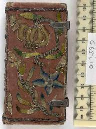 Keywords: The Whole Booke of Davids Psalmes. - Upper cover (c65i10).jpg Style Pictorial; Caption Upper cover; Colour Pink; Edge Unspecified exhibition history Decorative Technique Embroidered; Cover Material Satin 2 pairs of metal clasps object history Text 1644; Edinburgh; Unspecified object type Cc-zero place of creation Binding England place of discovery Alexandra Walsham 'Jewels for gentlewomen; religious books as artefacts in late medieval and early modern England' in ed Swanson The church and the book 2004 pp 123-142 British Library image http //www bl uk/catalogues/bookbindings/LargeImage aspx RecordId 020-000002376 ImageId ImageId 40793 Copyright BL The Whole Booke of Davids Psalmes Uploaded with GWToolset The Whole Booke of Davids Psalmes - Upper cover c65i10 http //www webarchive org uk/bldatasets/bindings/5285_4 jpg Bookbinding 17th-century bookbinding British Library Bookbindings |