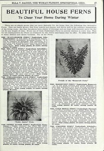 Keywords: The wonderful new rose hoosier beauty (16388757635).jpg Fine young plants 15 cents; strong <br> plants 50 cents <br> Teddy Junior Fern <br> THE TEDDY JUNIOR FERN Nephrolepis Teddy <br> Junior Teddy Junior the Fern for every <br> household This grand Fern was introduced re- <br> cently by G R The fronds are broad and <br> beautifully tapered from base to tip; they droop <br> just enough to make a shapely graceful plant <br> permitting it to finish with a fine full center and <br> perfect symmetrical spread The pinnae are dis- <br> tinctly undulated giving the fronds an attractive <br> wavy appearance which adds materially to their <br> charming decorative effect Teddy Junior will <br> produce about four times more fronds than any <br> other Fern ever introduced finishing with fifty <br> to sixty fronds in a four-inch pot Fine young <br> plants 15 cents; strong plants 50 cents <br> Fronds of the Roosevelt Fern <br> THE ROOSEVELT FERN Nephrolepis Roosevelt <br> It is our good fortune and great pleasure to <br> offer this wonderful new Fern having introduced <br> it in 1910 In this short time it stands second in <br> popularity of all the Ferns and will soon be more <br> popular than even the old favorite Boston Fern <br> In general characteristics it resembles the world- <br> famous Boston Fern but it will sweep that Fern <br> from the boards for two reasons; it produces <br> many more fronds than the Boston thus making <br> a bushier handsomer plant; then the pinnae are <br> beautifully undulated giving the Roosevelt a <br> pronounced wavy effect seen in no other Fern; <br> as the plant ages this effect becomes quite dis- <br> tinct A charming and most notable variety <br> Fine young plants 20 cents; strong plants 65 <br> cents <br> THE GOLD MEDAL FERN Nephrolepis Piersonii <br> This Fern received a gold medal from the So- <br> ciety of American Florists and Ornamental Horti- <br> culturists and is the only gold medal ever <br> awarded by them for any plant whatsoever An <br> entirely new form of the Boston Fern The pin- <br> nae subdivide making miniature fronds which <br> are superimposed on the main fronds looking as <br> if two or even three were condensed into one <br> giving the plant a graceful feathery and plumy <br> effect Fine young plants 15 cents; strong plants <br> 50 cents <br> THE CRESTED FERN Nephrolepis Scholzeli <br> The fronds are crested and stand erect with a <br> graceful arch forming a plant of ideal shape and <br> they never break down giving the plant a ragged <br> appearance as is so often the case with other <br> plumed forms; furthermore the loose elegant <br> arrangement of the fronds allowing a free cir- <br> culation of air through the foliage prevents the <br> center of even the largest specimen from becom- <br> ing defective or yellow The smallest salable <br> plants perfectly express the type and in every <br> size are models of beauty for table decorations <br> Fine young plants 15 cents; large plants 50 <br> cents 41856314 131010 64616 Page 17 Text http //www biodiversitylibrary org/page/41856314 1918 10 5962/bhl title 64616 Ella V Baines Firm ; Henry G Gilbert Nursery and Seed Trade Catalog Collection NameFound Nephrolepis NameConfirmed Nephrolepis EOLID 61678 NameBankID 2644730 NameFound Splendida NameConfirmed Splendida NameBankID 5329744 Biodiversity Heritage Library Miss Ella V Baines the woman florist Springfield Ohio The wonderful new rose hoosier beauty Garden Stories Bulbs Plants Catalogs Flowers Plants Ornamental Roses Seed industry and trade Seeds Trade catalogs U S Department of Agriculture National Agricultural Library bhl page 41856314 dc identifier http //biodiversitylibrary org/page/41856314 bhlGardenStories BHLinbloom bulbs plants plants ornamental u s department of agriculture national agricultural library bhlgardenstories bhlinbloom Information field Flickr posted date ISOdate 2015-01-28 CC-BY-2 0 BioDivLibrary https //flickr com/photos/61021753 N02/16388757635 2015-08-24 07 51 34 cc-by-2 0 PD-old-70-1923 The wonderful new rose hoosier beauty Photos uploaded from Flickr by FĂŚ using a script |