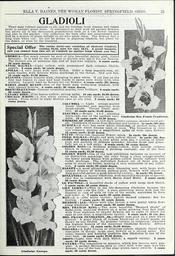| Keywords: The wonderful new rose hoosier beauty (16362817496).jpg ELLA V BAINES THE WOMAN FLORIST SPRINGFIELD OHIO <br> 33 <br> GLADIOLI <br> Their easy culture appeals to all and the freedom from disease and insect <br> pests is another great asset It associates so well with all garden flowers <br> but above all is the decorative possibilities both as a cut flower subject <br> and also in the garden Our collection we here offer are unsurpassed and <br> will be a source of great delight to all who plant them The flowers last a <br> long time when cut Do not be stingy in planting Gladioli but plant by <br> the dozen or even by the hundred <br> QnArial dfff f The entire forty-one varieties of choicest Gladioli <br> °K CW U VUBI costing 3 52 sent for only 2 75 A great bargain <br> and you cannot beat this set of Gladioli no matter from whom you buy <br> AMERICA Too much cannot be said of this beautiful dainty pink tinted <br> lavender It is sold by the millions to florists who use it for cut flowers <br> The flowers are of immense size and of wax-like texture 6 cents each; <br> 50 cents dozen <br> ANNIE WIGMAN Light yellow with pronounced dark crimson blotch; <br> superb 6 cents each; 50 cents dozen <br> APOLIiO A very large wide open flower Color a deep begonia-rose al- <br> most scarlet with delicate white markings in the throat New and fine <br> 15 cents each; 1 50 dozen <br> AUGUSTA Opens delicate pink changing to pure white If cut just as the <br> first bud begins to open and kept inside it opens pure white with blue <br> anthers Largely used by florists for cut flowers 6 cents each; 50c dozen <br> BARON JOSEF HULOT One of the finest deep violet-blue Gladioli with <br> well opened flowers 6 cents each; 50 cents dozen <br> BRENCHLEYENSIS Intense vermilion-scarlet very brilliant 6 cents each; <br> 50 cents dozen <br> CANARY BIRD Fine lemon-yellow; strong spike 10 cts each; 1 00 dozen <br> CHICAGO WHITE A fine white variety with lavender stripes on lower <br> petals From seven to eight flowers open at one time 7 cents each; 65 <br> cents dozen <br> Gladiolus Mrs Frank Pendleton <br> Gladiolus Europa <br> COLUMBIA Light orange-scarlet <br> freely blotched and penciled with <br> blush-purple Throat freely mot- <br> tled 10 cents each; 1 00 dozen <br> ELECTRA Bright and pleasing <br> brick-red; one of the earliest vari- <br> eties 15 cents each; 1 50 dozen <br> EMPRESS OF INDIA A rich dark velvety crimson shaded royal pur- <br> ple Certificate of merit from Haarlem and London 8c each; 80c doz <br> EUROPA A very fine snow white Gladiolus of perfect form with <br> many pure white blooms open at once The formation is close <br> and compact making a magnificent spike of wide open flowers <br> 12 cents each; 1 25 dozen <br> FAUST Wine-red immense flower; extra 5c each; 50c dozen <br> FRED WIGMAN Bright red with yellow throat 6c each; 50c doz <br> GLORY OF HOLLAND A new white with sligl t tinting of blush- <br> pink and anthers of delicate lavender; blooms large and grace- <br> fully set on a tall spike 6 cents each; 50 cents dozen <br> GOLDEN KING A brilliant golden-yellow with intense crimson <br> blotch in throat making a striking contrast; one of the best <br> 15 cents each; 1 50 dozen <br> GOLDEN WEST One of the best exhibition varieties on account of <br> its distinctive markings the color being a clear orange-scarlet <br> the lower petals blazed with golden-yellow faintly suffused with <br> violet shadings The individual flowers are of large size and <br> seem to stand out boldly making it very noticeable in any collec- <br> tion 8 cents each; 80 cents dozen <br> HALLEY A most attractive early blooming sort with large well- <br> opened flowers of delicate salmon-pink flowers well placed on <br> long graceful spikes; a most beautiful variety 5c each; 50c dozen <br> HOLLANDIA A dainty Gladiolus with beautiful shadings of apricot; <br> very fine in combination with Baron Josef Hulot 5 cents each; <br> 50 cents dozen <br> LE PACTOLE A beautiful shade of yellow with large dark blotch <br> 5 cents each; 50 cents dozen <br> LILY LEHMAN This is the lily-flowering Gladiolus because the <br> flowers resfrr ble the Lily A pure glistening white with just the <br> faintest ti ting of pink on tips of the petals; matchless in form <br> and colori g 7 cents each; 65 cents dozen <br> MAY A n cable white variety lightly -flecked crimson; fine for <br> forcing 7 cents each; 65 cents dozen <br> MEADOW VALE White with lilac throat a very pretty white flow- <br> ering Gladiolus 7 cents each; 65 cents dozen <br> MRS FRANCIS KING The most beautiful Besnard shade of <br> flame-pink immense flowers on a spike growing four feet high <br> with from eighteen to twenty flowers six to eight of which are <br> open at one time; a magnificent variety 6 cents each; 50 cts doz <br> MRS FRANK PENDLETON JR Bright rose-pink on a pure white <br> ground A giant blotch of richest blood-red on lower petals; as <br> showy as any Orchid No grander variety in existence Awarded <br> the highest honors of the American Gladiolus Society Always <br> a prize winner 15 cents each; 1 50 dozen <br> NIAGARA A light Crocus or primrose-yellow slightly tinted with <br> rose-pink in throat; large open flowers on a strong spike For <br> color texture and keeping qualities this Gladiolus is one of the <br> very best 10 cents each; 1 00 dozen <br> ORION Light rose with dark blotch; a superb variety 5 cents <br> each; 50 cents dozen <br> PANAMA The companion to America which has become very pop- <br> ular A perfect Hermosa-pink in color with wide open wax-like <br> flowers; one of the best of the clear pinks; many awards 8 cents <br> each; 80 cents dozen 41856298 131010 64616 Page 33 Text http //www biodiversitylibrary org/page/41856298 1918 10 5962/bhl title 64616 Ella V Baines Firm ; Henry G Gilbert Nursery and Seed Trade Catalog Collection NameFound Hollandia NameConfirmed Hollandia EOLID 68431 NameBankID 2991467 NameFound Orchid Biodiversity Her