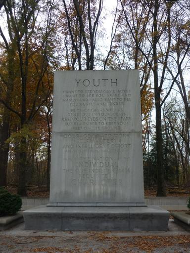 Keywords: The Youth stone tablet.JPG en One of four tablets which stand on both sides of the Theodore Roosevelt Sculpture on Theodore Roosevelt Island This tablet bears quotes on the subject of the Youth I want to see you game boys I want to see you brave and manly and I also want to see you gentle and tender Be practical as well as generous in your ideals Keep your eyes on the stars and keep your feet on the ground Courage hard work self-mastery and intelligent effort are all essential to successful life Alike for the nation and the individual the one indispensable requisite is character 2013-11-21 14 17 37 own Discol Uploaded with UploadWizard Theodore Roosevelt Island National Memorial |