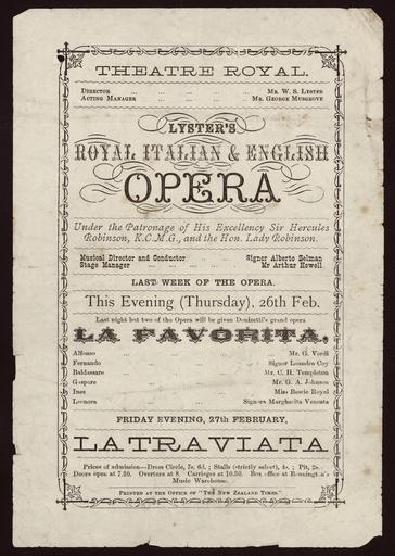 | Keywords: document text writing plaque monochrome Flier programme is an arrangement of text, some ornate, with a simple decorative border. Various personnel are named: Mr W S Lyster (director), Mr George Musgrove (acting manager), Signor Alberto Zelman (musical director and conductor), Mr Arthur Howell (stage manager). Performers were: Mr G Verdi, Signor Leandro Coy, Mr C H Templeton, Mr G A Johnson, Miss Bessie Royal, Signora Margherita Venosta. Quantity: 1 b&w art print(s). Physical Description: Letterpress on flier, 215 x 147 mm. New Zealand Times Company Ltd. Theatre Royal (Wellington) :Lyster's Royal Italian & English Opera, under the patronage of His Excellency Sir Hercules Robinson, K.C.M.G, and the Hon Lady Robinson ... this evening (Thursday) 26th Feb ... Donizetti's grand opera "La Favorita". Friday evening 27th February "La traviata". Printed at the office of "The New Zealand Times" [1880]. [Ephemera and theatre programmes for performances of opera and light musicals in New Zealand in the 1880s].. Ref: Eph-A-OPERA-1880-01. Alexander Turnbull Library, Wellington, New Zealand. natlib.govt.nz/records/22888314 Flier programme is an arrangement of text, some ornate, with a simple decorative border. Various personnel are named: Mr W S Lyster (director), Mr George Musgrove (acting manager), Signor Alberto Zelman (musical director and conductor), Mr Arthur Howell (stage manager). Performers were: Mr G Verdi, Signor Leandro Coy, Mr C H Templeton, Mr G A Johnson, Miss Bessie Royal, Signora Margherita Venosta. Quantity: 1 b&w art print(s). Physical Description: Letterpress on flier, 215 x 147 mm. New Zealand Times Company Ltd. Theatre Royal (Wellington) :Lyster's Royal Italian & English Opera, under the patronage of His Excellency Sir Hercules Robinson, K.C.M.G, and the Hon Lady Robinson ... this evening (Thursday) 26th Feb ... Donizetti's grand opera "La Favorita". Friday evening 27th February "La traviata". Printed at the office of "The New Zealand Times" [1880]. [Ephemera and theatre programmes for performances of opera and light musicals in New Zealand in the 1880s].. Ref: Eph-A-OPERA-1880-01. Alexander Turnbull Library, Wellington, New Zealand. natlib.govt.nz/records/22888314 |