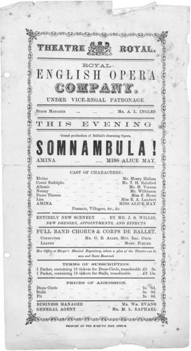 Keywords: blackandwhite monochrome text document writing black and white Arrangement of text with decorative border. Lists the cast of characters; the performers include: Mr Henry Hallam, Mt T H Rainford, Mr H Vernon, Mr Wilkinson, Miss F Howe, Miss E A Lambert, Miss Alice May. Entirely new scenery by Mr J S Willis. New dresses, appointments, and effects. Full band chorus & corps de ballet. Conductor Mr G B Allen, Leader Mons[ieur] Fleury. Quantity: 1 b&w photo-mechanical print(s). Physical Description: Letterpress on handbill 285 x 152 mm. Theatre Royal (Wellington) :Royal English Opera Company under vice-regal patronage. This evening, Grand production of Bellini's charming opera, "SOMNAMBULA!". Amina ... Miss Alice May. Printed at the Evening Post Office [1874].. [Theatre programmes for opera performances in New Zealand. 1870s].. Ref: Eph-B-OPERA-1874-01. Alexander Turnbull Library, Wellington, New Zealand. natlib.govt.nz/records/23163617 Arrangement of text with decorative border. Lists the cast of characters; the performers include: Mr Henry Hallam, Mt T H Rainford, Mr H Vernon, Mr Wilkinson, Miss F Howe, Miss E A Lambert, Miss Alice May. Entirely new scenery by Mr J S Willis. New dresses, appointments, and effects. Full band chorus & corps de ballet. Conductor Mr G B Allen, Leader Mons[ieur] Fleury. Quantity: 1 b&w photo-mechanical print(s). Physical Description: Letterpress on handbill 285 x 152 mm. Theatre Royal (Wellington) :Royal English Opera Company under vice-regal patronage. This evening, Grand production of Bellini's charming opera, "SOMNAMBULA!". Amina ... Miss Alice May. Printed at the Evening Post Office [1874].. [Theatre programmes for opera performances in New Zealand. 1870s].. Ref: Eph-B-OPERA-1874-01. Alexander Turnbull Library, Wellington, New Zealand. natlib.govt.nz/records/23163617 |