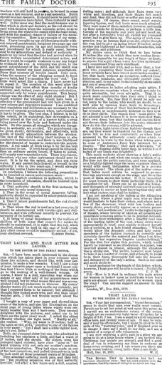 | Keywords: TheFamilyDoctorJan5 1889page295.png THE FAMILY DOCTOR teachers will stilt hold in reserve to be used in some cases as a last resource and as a sad necessity But it should be a last resource It should never be used until all other measures have failed Then it should be used well In the same way that the most humane war is that which is short and decisive so the rod should be used with decision when the necessity arises so as to bring about the wished-for result with the least delay and with the smallest chance of failure or the necessity for repetition Here is an example of my meaning I have brought up my children practically without corporal punishment but about two years ago one child presuming upon its age and immunity from any punishment for which it really cared became deaf to my admonitions and defiant of authority I made up my mind that the time had arrived when its future welfare necessitated determined action and that it would be culpable weakness in me any longer to withhold the rod A whipping was given to the great astonishment of the child and the result was successful beyond my most sanguine expectations From that moment all trouble ceased Only once when the memory of the whipping seemed to have grown faint had I to mention the word rod The little word acted like a charm I have never had to repeat it The mention of this word after the whipping had more effect than months of kindly entreaty and indeed years of previous exhortation supported only by minor punishments This happy change was the effect of only eight strokes But I doubt whether the whipping would have been so effective if the punishment had not been given in a very solemn and impressive 111anner I am confidp nt that regulation and deliberation are necesiiary to the success of corporal punishment when unfortunately it has to be given The bpst plan I believe is to lay the culprit in its nightdress face downwards on a pillow placed at the end of a narrow table a strap being passed over the bod y and fastened under the table By this means all struggles which are derogatory to authority are avoided The punishment can be given slowly deliberately and effectively with words of kindly admonition between the st·rokes The fact of the child feeHng itself helpless is also conducive to submission and there is less likelihood for the element of temper to enter into the punishment A rod nlade of hirch twigs i~ by far the best instrument to use If birch twigs cannot be obtained then an ordinary garden broom if taken to pieces will supply very respectable rods There is no reason therefore why any other instrument should ever be used It i~ by far the safest and does not raise wales If any 'parent finds himRelf or herself in the difficulty I was in two years ago I would strongly advise the course I have recOlnlnended In conclusion I believe the following propositions to be founded on reason and common sense- 1 That implicit obedience to authority \\-h ch i3 the foundation of education should be insisted upon in every household 2 That authority should in the first instance be supported hy only moral measures 3 That in the event of nlOral measures failing authority should be r;upported by minor punish nents ; but never by bribery 4 That if nlinor punishments fail the rod s~ould then be used 5 That when the rod is used as a last re~o~ p·ce it should be administered with forethought an l deliberation and with sufficient severity to prevent t'le necessity of its further use 6 It being ef equal importance to the welfare of children of both sexes that respw t fe · authority should be 111aintained it is right that the rod when required should be used in the ca3e of both sexes Any other course would be manifestly unjust -I am your obedient servant COMMON SENSE TIGHT LACING AND MALE ATTIRE FOR LADIES TO THE EDITOR OF THE FAMILY DOCTOR SIR --I have been much interested in the discussion which has taken place in your columns upon these two subjects and should like with your permission to make a few remarks Until I saw a copy of your valuable paper upon a bookstall I must confess that I knew little or nothing of the items which go to the making of a well-dressed woman Of course I knew in a dull masculine way when my sisters or any other lady of my acquaintance were well dressed but by what means this end was accomplished I did not endeavour to discover My sisters' slender waists did not much excite my curiosity not that I supposed them to be natural but although I thought they looked more trim and chic than larger waisted girls I did not trouble myself about the matter I bought a copy of your paper and showed them some of the letters and also the illustrations on the front page of young ladies whose waists were certainly smaller than any I have seen They seemed delighted with the pictures and asked me to let them see the paper every week I asked the eldest Maude whether she tight laced Hardly at all she replied Why my waist is 18 inches; half as big again as this girl's pointing to one of the figures in your paper but I shall lace a little tighter now sba'n't you Belle Belle my youngest sister but one who admitted to twitching her staylaces a little and had a waist of 17 inches said she should My sisters even the youngest aged sixteen have since gone in for waist nipping with not only my mother's sanction but even approbation They had stays made at one of the best corsetières and pulled themselves in inch by inch until all three possessed waists of 16 inches They admitted suffering much pain and they told me the pinching sensation was at first perfectly horrible but after few hours only a dull numbed feeling came; and although their faces were very white and bloodless and their thighs felt numb and dead they did not faint or suffer any pain worth mentioning Of course their round small waists tapering figures and full busts were lnuch admired They were none of thern satisfied however and made up their minds for 15 inches or perhaps