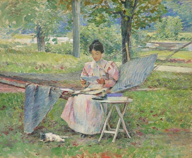 Keywords: Theodore Robinson - Correspondence (1895).jpg Artwork Creator Theodore Robinson 1895 oil canvas cm 45 7 55 9 institution Minnesota Marine Art Museum accession number http //www mmam org/Visit/Collections/Impressionism-and-Post-Impressionism Minnesota Marine Art Museum object history Macbeth Gallery New York 1913<br/>H F Field<br/>Sale Estate of Thomas R Ball New York and Francis White Baltimore et al American Art Association New York March 13-14 1919 lot 132 illustrated as Girl in a Hammock Reading <br/>Holland Galleries<br/>Sale Hon James Smith et al American Art Association New York November 28 1924 lot 42<br/>M Knoedler Co New York<br/>Sale Estate of F W Woolworth Edwin Baldwin et al American Art Association New York January 5 1927 lot 146 illustrated as Lady Reading <br/>David Roberts<br/>Jerome Konheim New York 1946<br/>Tessie Konheim New York by descent as of 1960 <br/>Doris Konheim Rubin and Harry Rubin New York by descent as of 1982 <br/>Private Collection Rubin family member credit line on loan from a private collection exhibition history New York Society of American Artists Catalogue of the 18th Exhibition 1896 March-May 1896 no 213 p 55<br/> Brooklyn New York The Brooklyn Museum The Brooklyn Institute of Arts and Sciences Theodore Robinson 1852-1896 November 1946-January 1947 no 46 p 60 illustrated pl XXXVI<br/>2014 Minnesota Marine Art Museum Impressionism Post-Impressionism Working Towards a Closer Relationship with Nature and Life TH ROBINSON ~ lower right signature http //www sothebys com/en/auctions/ecatalogue/2012/american-art-n08911/lot 20 lotnum html Sotheby's New York 29 November 2012 lot 20 PD-old-auto-1923 1896 Theodore Robinson Minnesota Marine Art Museum Portrait paintings of women 1890s portrait paintings Females reading in art Reading letters Images from Sotheby's |