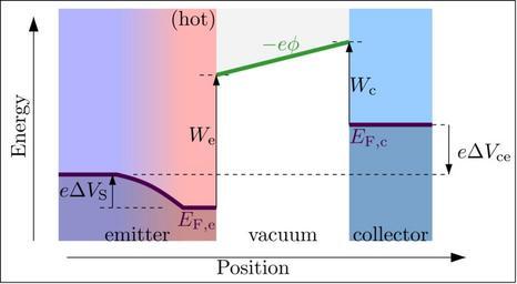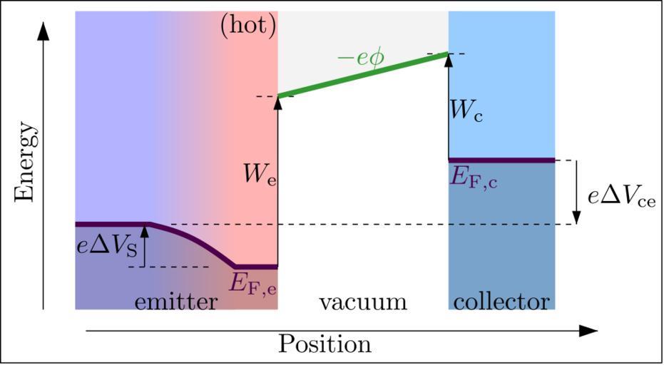 | Keywords: Thermionic diode reverse bias.svg en Thermionic effect diode under reverse bias retarding potential or retarding diode useable for measuring the work function of the cold collector 2013-06-17 21 31 00 own Nanite Source code Made using Ipe Source code below also placed into public domain <source lang xml > < xml version 1 0 > < DOCTYPE ipe SYSTEM ipe dtd > <ipe version 70005 creator Ipe 7 1 2 > <info created D 20130513204549 modified D 20130617212753 /> <ipestyle name cust > <symbol name arrow/fnormal spx > <path fill black > 0 0 m -1 0 333 l -1 -0 333 l h </path> </symbol> <pen name heavier value 0 8 /> <pen name fat value 1 2 /> <pen name ultrafat value 2 /> <symbolsize name large value 5 /> <symbolsize name small value 2 /> <symbolsize name tiny value 1 1 /> <arrowsize name large value 10 /> <arrowsize name small value 5 /> <arrowsize name tiny value 3 /> <dashstyle name dashed value 4 0 /> <dashstyle name finedash value 2 0 /> <textsize name large value \large /> <textsize name small value \small /> <textsize name tiny value \tiny /> <textsize name Large value \Large /> <textsize name LARGE value \LARGE /> <textsize name huge value \huge /> <textsize name Huge value \Huge /> <textsize name footnote value \footnotesize /> <textstyle name center begin \begin center end \end center /> <textstyle name itemize begin \begin itemize end \end itemize /> <textstyle name item begin \begin itemize \item end \end itemize /> <gridsize name 4 pts value 4 /> <gridsize name 8 pts ~3 mm value 8 /> <gridsize name 16 pts ~6 mm value 16 /> <gridsize name 32 pts ~12 mm value 32 /> <gridsize name 10 pts ~3 5 mm value 10 /> <gridsize name 20 pts ~7 mm value 20 /> <gridsize name 14 pts ~5 mm value 14 /> <gridsize name 28 pts ~10 mm value 28 /> <gridsize name 56 pts ~20 mm value 56 /> <anglesize name 90 deg value 90 /> <anglesize name 60 deg value 60 /> <anglesize name 45 deg value 45 /> <anglesize name 30 deg value 30 /> <anglesize name 22 5 deg value 22 5 /> <opacity name filled value 0 2 /> <layout paper 248 136 origin 0 0 frame 248 136 /> <gradient name bluered type axial coords 0 0 32 0 > <stop offset 0 color 0 7 0 7 1 /> <stop offset 1 color 1 0 7 0 7 /> </gradient> <tiling name falling angle -60 step 4 width 1 /> <tiling name rising angle 30 step 4 width 1 /> </ipestyle> <page> <layer name alpha /> <layer name BBOX /> <view layers alpha BBOX active alpha /> <path layer alpha fill 0 95 > 100 132 m 104 100 l 168 116 l 172 132 l h </path> <path matrix 1 0 0 1 -120 -644 fill 0 6 0 8 1 > 288 776 m 288 664 l 328 664 l 328 776 l h </path> <path fill black opacity filled > 208 76 m 208 20 l 168 20 l 168 76 l h </path> <path fill 0 7 0 7 1 > 64 132 m 64 20 l 28 20 l 28 132 l h </path> <path matrix 1 0 0 1 -120 -644 fill 1 0 7 0 7 > 224 776 m 224 664 l 200 664 l 200 776 l h </path> <path matrix 1 0 0 1 56 20 fill white gradient bluered > 32 112 m 32 0 l 0 0 l 0 112 l h </path> <path fill black opacity filled > 28 52 m 56 52 l 72 48 88 36 s 104 36 l 104 20 l 28 20 l </path> <path matrix 1 0 0 1 0 4 stroke black pen ultrafat > 4 100 m 4 100 l 4 100 l 4 100 l h </path> <path stroke black arrow fnormal/normal > 16 20 m 16 128 l </path> <path matrix 1 0 0 1 -104 -652 stroke black arrow fnormal/normal > 136 664 m 328 664 l </path> <text matrix 0 1 -1 0 796 -100 pos 160 784 stroke black type label width 30 884 height 6 815 depth 1 93 valign baseline >Energy</text> <text matrix 1 0 0 1 2 663 -685 875 transformations translations pos 101 337 719 875 stroke black type label width 18 901 height 6 808 depth 2 85 halign right valign top >\textcolorrgb 0 3 0 0 3 E_ \rm F e </text> <text matrix 1 0 0 1 -88 -652 transformations translations pos 192 656 stroke black type label width 35 34 height 6 808 depth 0 valign baseline >Position</text> <path matrix 1 0 0 1 -120 -660 stroke black dash finedash > 216 760 m 232 760 l </path> <path matrix 1 0 0 1 -56 -644 stroke black dash finedash > 216 760 m 232 760 l </path> <path matrix 1 0 0 1 -16 -684 stroke black dash finedash > 216 760 m 232 760 l </path> <path matrix 1 0 0 1 -120 -660 stroke black dash finedash > 168 696 m 200 696 l </path> <path matrix 1 0 0 1 -120 -660 stroke black dash finedash > 184 712 m 336 712 l </path> <text matrix 1 0 0 1 -124 -656 transformations translations pos 228 724 stroke black type label width 13 45 height 6 812 depth 1 49 halign right valign baseline > W_ \rm e </text> <text matrix 1 0 0 1 -60 -632 transformations translations pos 228 724 stroke black type label width 13 45 height 6 812 depth 1 49 valign baseline > W_ \rm c </text> <text matrix 1 0 0 1 -84 -660 transformations translations pos 136 704 stroke black type label width 23 651 height 6 812 depth 1 49 halign right valign center > e\Delta V_ \rm S </text> <text matrix 1 0 0 1 -118 -772 transformations translations pos 184 792 stroke black type label width 31 576 height 6 654 depth 0 halign center valign baseline >emitter</text> <text matrix 1 0 0 1 -48 -772 transformations translations pos 184 792 stroke black type label width 33 486 height 4 289 depth 0 halign center valign baseline >vacuum</text> <text matrix 1 0 0 1 4 -772 transformations translations pos 184 792 stroke black type label width 36 557 height 6 918 depth 0 halign center valign baseline >collector</text> <text matrix 1 0 0 1 -36 -52 transformations translations pos 256 112 stroke black type label width 26 335 height 6 812 depth 1 49 valign baseline > e\Delta V_ \rm ce </text> <text matrix 1 0 0 1 66 663 -645 875 transformations translations pos 101 337 719 875 stroke black type label width 18 901 height 6 808 depth 2 85 valign top >\textcolorrgb 0 3 0 0 3 E_ \rm F c </text> <text matrix 1 0 0 1 -104 -680 transformations translations pos 248 792 stroke black type label width 18 324 height 6 926 depth 1 93 halign right valign baseline >\textcolorrgb 0 2 0 6 0 2 -e\phi </text> <text matrix 1 0 0 1 -12 -36 transformations translations pos 116 160 stroke black type label width 22 139 height 7 473 depth 2 49 halign righ