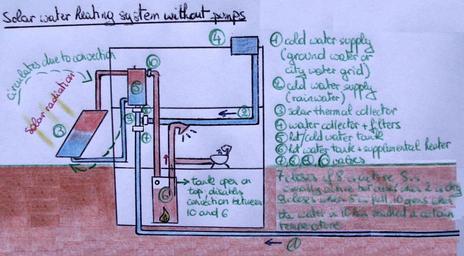 MAKE A MEME View Large Image Thermosiphon solar water heating system 2.JPG en A schematic of a thermosiphon solar water heating system Thermosiphon systems do not have pumps increasing durability and decreasing operation costs The schematic was based on a schematic by ...