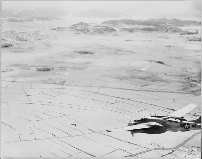 | Keywords: These rockets are shown in this photo, all of them speeding towards enemy targets of the Communist in North Korea - NARA - 542224.tif Scope and content These rockets are shown in this photo all of them speeding towards enemy targets of the Communist in North Korea One has just exploded at the left and the other two can be recognized by their fiery tails This barrage was released by a formation of B-26s of the Far East Air Forces 452nd Light Bomb Wing one of which is seen No enemy target however well camouflaged escapes for very long the prying eyes of FEAF reconnaissance planes and when spotted fighters and bombers are called in for the clean-up General notes 542224 Local identifier 342-AF-79627AC Department of Defense Department of the Air Force 09/26/1947 - Still Picture Records Section Special Media Archives Services Division NWCS-S National Archives at College Park 8601 Adelphi Road College Park MD 20740-6001 ca 02/1951 Record group Record Group 342 Records of U S Air Force Commands Activities and Organizations 1900 - 2003 Record group ARC 654 Black and White Photographs of U S Air Force and Predecessors' Activities Facilities and Personnel Domestic and Foreign compiled 1930 - 1975 documenting the period 1863 - 1975 Series ARC 542185 File unit File unit ARC Variant control numbers Agency-Assigned Identifier NASM 4A 37194<br /> NAIL Control Number NWDNS-342-AF-79627AC yes Other versions NARA-cooperation PD-USGov Bombing during the Korean War B-26 Invaders in the Korean War |