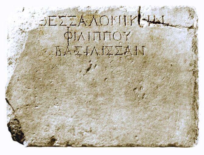 Keywords: Thessaloniki-ancient inscription.png Inscribed base of a statue of Thessaloniki of the 2nd c B C found in the area of the ancient Agora and part of a group of statues of the family of Alexander the Great Inscription ΘΕΣΣΑΛΟ ΙΚΗ ΦΙΛΙΠΠΟΥ ΒΑΣΙΛΙΣΣΑ Ενε ίγραφο βάθρο αγάλματος της Θεσσαλονίκης Πρόκειται για τμήμα βάθρου με αγάλματα της οικογένειας του Φιλί ου Β΄ ου είχαν στηθεί εκεί το 2ο αι μ Χ Ένα α ό αυτά σύμφωνα με την ε ιγραφή εικόνιζε τη Θεσσαλονίκη κόρη του Φιλί ου και γυναίκα του Κασσάνδρου ου έδωσε το όνομά της στην όλη Ε ιγραφή ΘΕΣΣΑΛΟ ΙΚΗ ΦΙΛΙΠΠΟΥ ΒΑΣΙΛΙΣΣΑ own Philly boy92 2nd century BC PD-old-100 cc-by-sa-3 0 2 5 2 0 1 0 GFDL Ancient Greek inscriptions in the Archaeological Museum Thessaloniki 2nd-century BC inscriptions in Greece 2nd-century BC art in Thessaloniki Philip II |