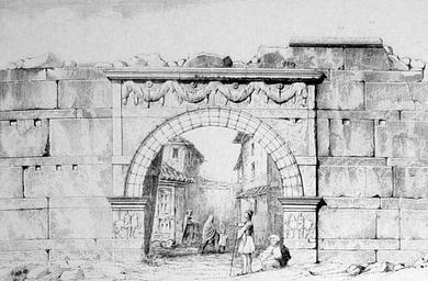 | Keywords: Thessaloniki Golden Gate Daumet.jpg La Porte d'Or à Thessalonique gravure de l'arc de triomphe incorporé dans le rempart oriental de la ville L Heuzey et L Daumet 1867 L Daumet ; scan by Marsyas PD-old Engraving of Thessaloniki 1867 Ancient Roman gates in Greece Thessaloniki Historical images of Greece Thessaloniki |