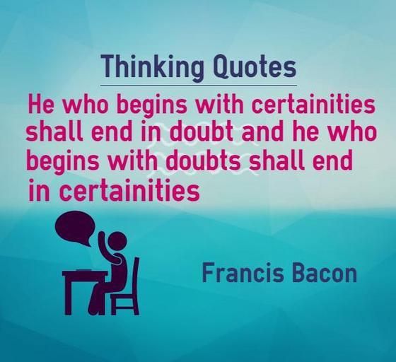 | Keywords: Thinking Quotes He who begins with certainties shall end in doubt and he who begins with doubts shall end in certainities Quote by Francis Bacon Thinking quote Explanation If you are certain about something, when taking other’s opinion doubt enters into our mind and we end up doubting our... www.braintrainingtools.org/skills/thinking-quotes-begin-w... | ||||
