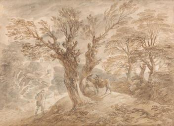 Keywords: Thomas Gainsborough - Wooded Landscape with Peasant and Donkeys - Google Art Project.jpg To Mr E- E- ; in graphite Edward Edwards Author of Anecdotes of Painting ; inscribed in graphite verso lower right 54 57 2 ; inscribed on label in graphite verso lower center 54 57 2 ; inscribed in graphite verso lower left E 2281 ; erased graphite marks verso upper left Inscription _Signed_and_Dated en Not signed not dated en Not on View en Brown and gray wash over graphite on medium slightly textured cream wove paper en donkeys traveler cottage trees landscape special url_id ogE7hY2k4HiKVg PD-old-100-1923 1788 Drawings by Thomas Gainsborough 18th-century landscape drawings Ink and wash paintings Collections of the Yale Center for British Art Google Art Project works by Thomas Gainsborough |