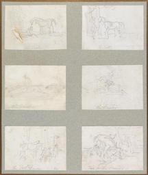 | Keywords: Thomas Rowlandson - Ages of the Horse- The Foal, The Colt, The Racer, The Hunter, The Post-Horse, Food for the Hounds - Google Art Project.jpg Inscribed in graphite top left image lower center The Foal ; in graphite top right image lower left The Colt ; in graphite middle left image lower left The Racer ; in graphite middle right image lower center The Hunter ; in graphite bottom left image lower left The Post Horse ; in graphite bottom right image lower left Food for the Hounds Inscription _Signed_and_Dated Not signed not dated Not on View Graphite on medium slightly textured cream laid paper mounted on very thick moderately textured blue wove paper hounds dogs horses animals jockeys sporting art special url_id gAFHVzyXIbcp0w PD-old-100-1923 1827 Drawings and watercolours by Thomas Rowlandson Google Art Project works by Thomas Rowlandson Drawings of horses |
