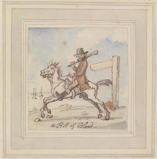 Keywords: Thomas Rowlandson - A Bit of Blood - Google Art Project.jpg Inscribed in pen and gray ink lower center in artist's hand a Bit of Blood Inscription _Marks BUTTANSH letters; similar to shorter 21 and 22 Inscription _Signed_and_Dated Not signed not dated Not on View Watercolor with pen and red-brown ink and graphite on medium lightly textured beige wove paper riding crop horse animal red man bit bridle component hat riding coat genre subject special url_id uAGAQvpcSjAQtg PD-old-100-1923 1827 Drawings and watercolours by Thomas Rowlandson Google Art Project works by Thomas Rowlandson Male horses |