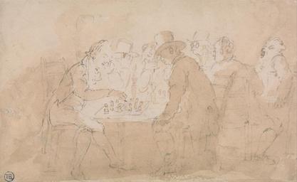 Keywords: Thomas Rowlandson - Chess Players - Google Art Project.jpg Inscribed in black ink lower left TEL Collector's stamp Lugt 2420a; verso in graphite lower left 467 JL ; in graphite lower right The Chess Players T Rowlindson Inscription _Signed_and_Dated Not signed not dated Not on View Pen and gray and brown ink with brown ink washes over graphite with pen and black ink line along the edges of the drawing on medium smooth cream wove paper men players chess games chairs table hats genre subject sporting art special url_id 4QHqFAyWZA0-Kw PD-old-100-1923 1827 Drawings and watercolours by Thomas Rowlandson Google Art Project works by Thomas Rowlandson Chess players in art |
