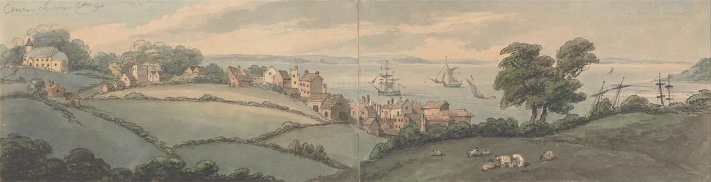 | Keywords: Thomas Rowlandson - Lyson's Cottage, Cowes, Isle of Wight - Google Art Project.jpg Inscribed in graphite upper left Cowes Lysons Cottages Inscription _Signed_and_Dated Not signed not dated Not on View Watercolor with pen and black ink over graphite on moderately thick slightly textured beige wove paper bushes sheep water village cottages coast trees buildings sails ships boats special url_id jQGJOrcJdh0avg PD-old-100-1923 1827 Drawings and watercolours by Thomas Rowlandson Google Art Project works by Thomas Rowlandson Cowes Isle of Wight |