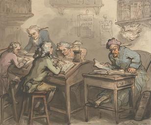 | Keywords: Thomas Rowlandson - A Merchant's Office - Google Art Project.jpg No inscription Inscription _Signed_and_Dated Signed and dated in pen in black ink lower right Rowlandson 1789 Not on View Watercolor with pen and black brown and gray ink over graphite on moderately thick moderately textured beige laid paper merchant men reading office chair stools desks shelves hanging quills writing - materials and instruments spectacles genre subject special url_id 5gF1AwrWdd74DA PD-old-100-1923 1827 Drawings and watercolours by Thomas Rowlandson Google Art Project works by Thomas Rowlandson Offices in the United Kingdom 1789 in England 1789 drawings Fashion in 1789 Merchants in art |