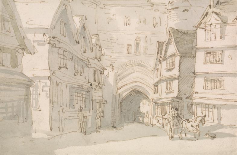Keywords: Thomas Rowlandson - The South Gate, Exeter - Google Art Project.jpg Inscribed in royal blue ink lower right Paul Mellon Collection seal D28141 LX Inscription _Signed_and_Dated Not signed not dated Not on View Pen and brown ink and wash on medium slightly textured blued white wove paper architectural subject horse animal south gate windows archway town buildings carriage cityscape figures representations special url_id -wEGCAHob_dDbg PD-old-100-1923 1827 Drawings and watercolours by Thomas Rowlandson Google Art Project works by Thomas Rowlandson History of Exeter |