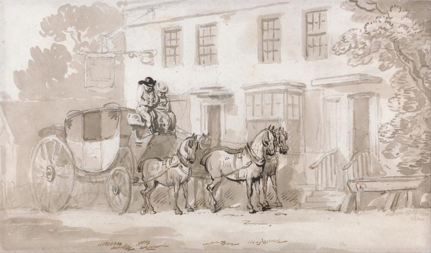 | Keywords: Thomas Rowlandson - A Stage Coach Outside of the Entrance of an Inn - Google Art Project.jpg  Inscribed on verso in graphite lower right P7938C 18 ; in graphite on mount lower left DLA 349 Inscription _Signed_and_Dated Not signed not dated Not on View Brown and gray wash with pen and black and brown ink over graphite on medium slightly textured blued white wove paper mounted on moderately thick moderately textured beige laid paper horses animals grass doorway windows wheels stairs inn trees stage coaches genre subject sign special url_id EAGv1ZxsUmrHsA PD-old-100-1923 1827 Drawings and watercolours by Thomas Rowlandson Google Art Project works by Thomas Rowlandson |