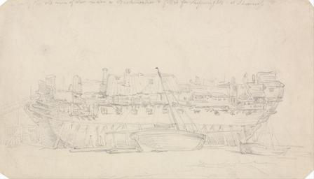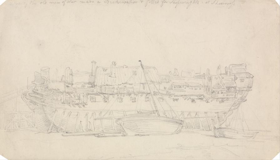 Keywords: Thomas Rowlandson - Study of a Hulk - Google Art Project.jpg Inscribed in graphite upper center One of the old men of War made a Brakewater and fitted for Shipwrights at Sherness Inscription _Marks watermarks horn design 1802 ; not in Shorter not in Churchill similar to no 324 Heawood see pls 352 353 Inscription _Signed_and_Dated Not signed not dated Not on View Graphite on medium slightly textured blued white laid paper oars ship ship study visual work marine art marine art hulk watercraft by form hulk watercraft by form boats boats special url_id egEwq1-CpZ_P6A PD-old-100-1923 1827 Drawings and watercolours by Thomas Rowlandson Google Art Project works by Thomas Rowlandson Drawings of ships |