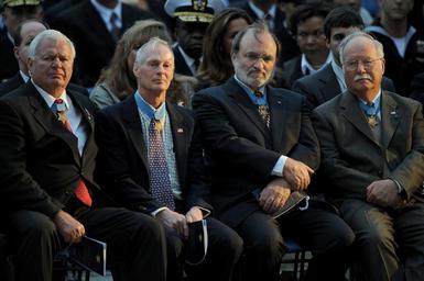 | Keywords: Thornton Norris Thacker Barnum.jpg en Medal of Honor recipients from left Michael Thornton USN; Thomas Norris USN; Brian M Thacker USA; and Deputy Assistant Secretary of the Navy for Reserve Affairs H C Barney Barnum Jr USMC attend a Medal of Honor flag presentation ceremony for Master-at-Arms 2nd Class Seal Michael A Monsoor at the Navy Memorial in Washington D C Monsoor has been posthumously awarded the Medal of Honor for diving onto a grenade to save his teammates in Ar Ramadi Iraq on Sept 29 2006 Monsoor also received the Silver Star for his actions in May during the same deployment in 2006 when he exposed himself to heavy enemy fire to rescue and treat an injured teammate Navy News Service https //navcms news navy mil/view_single asp id 57448 Image 080409-N-5319A-005 Mass Communication Specialist Brian Aho 2008-04-09 Public domain Crop showing only Norris File Thomas Norris 2008 jpg<br/>Crop showing only Thacker File Brian Thacker 2008 jpg Recipients of the Medal of Honor Group photographs of military people Harvey C Barnum Jr Brian Thacker Thomas R Norris Michael E Thornton PD-USGov-Military-Navy |