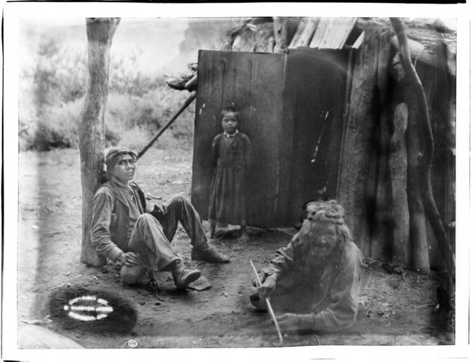 Photograph of three Havasupai Indians, Waluthama, his father and daughter, in front of their "Hawa" or dwelling, ca.1899. The elderly father half reclines on the ground holding a crooked stick in his right hand. Waluthama, sits with his knees up, legs spread, with his back to a wooden post of the ramada. The young daughter stands near the open rough wood door with her hands clasped behind her back.