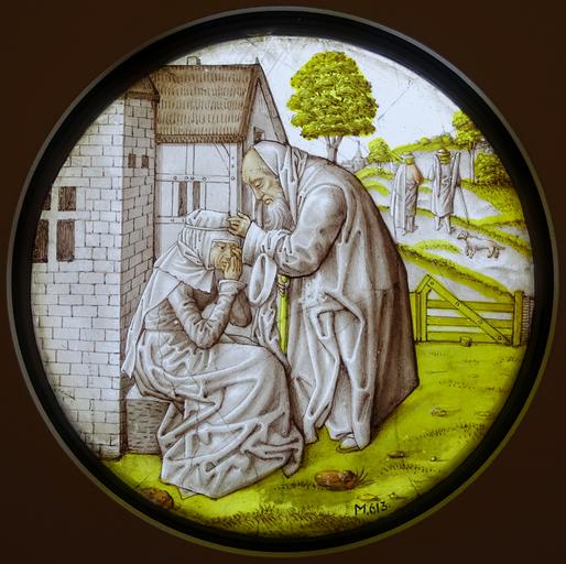 Keywords: Three Rounels from the Life of Tobias, 1. Tobit comforts Hanna, Southern Netherlands, c. 1500, stained glass - Museum Schnütgen - Cologne, Germany - DSC09853.jpg en Exhibit in the Museum Schnütgen - Cologne Germany 2015-11-29 07 52 19 own Daderot other versions PD-old-100 cc-zero Tondo windows of Museum Schnütgen Tobit |
