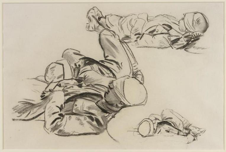 Keywords: Three studies of soldiers with bandaged heads.jpg Artwork en Three studies of soldiers with bandaged heads 1918 charcoal paper cm 481 625 http //www iwm org uk/collections/item/object/23745 Imperial War Museum Creator John Singer Sargent three studies of gassed British infantrymen lying on the ground The three men lie with their heads resting on improvised pillows made of blankets and equipment with their eyes covered with bandages PD-old-auto-1923 1925 Collections of the Imperial War Museum Gassed |