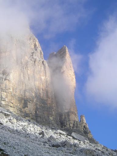 Keywords: three zinnen lavaredo small gargoyle yellow edge rock wall steep wall climbing wall rock dolomite dolomites mountains alpine south tyrol italy rubble field haze cloudy